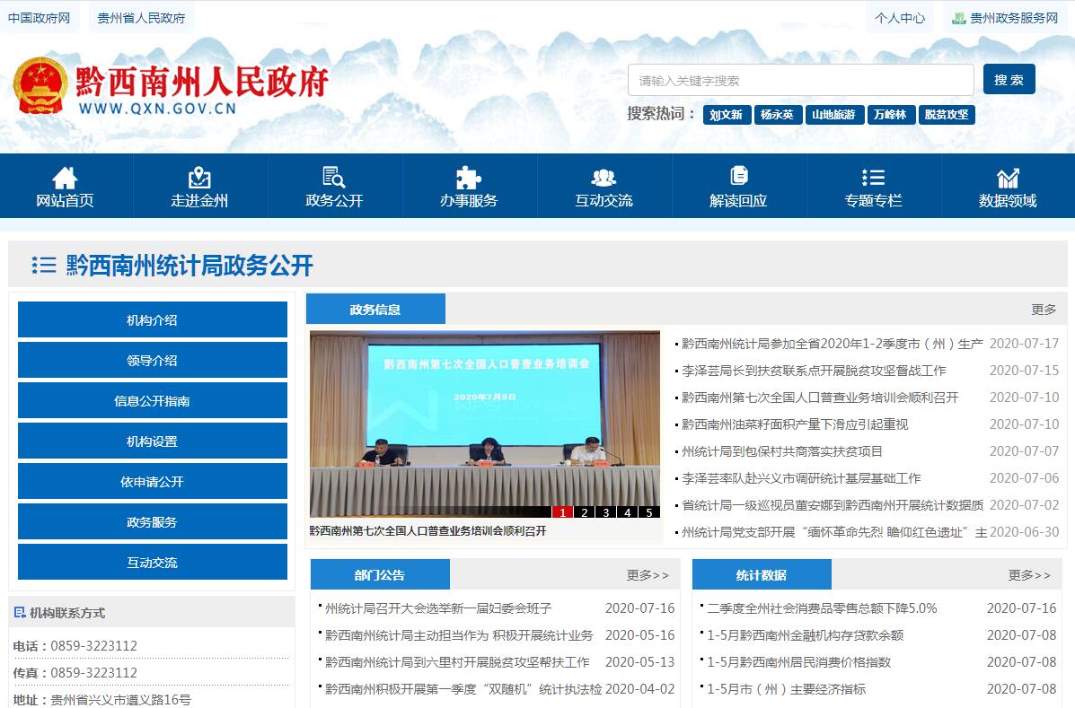 黔西南州统计局主要职责:(一)贯彻执行国家、省统计工作的方针、政策、法律、法规和统计标准、统计方法及统计报表制度,组织指导全州各县(市)、各部门的统计和国民经济核算工作。(二)搜集、整理、提供全州性的基本统计资料,并对国民经济、社会发展和科技进步情况进行统计分析、评估、预测和监督,向州委、州政府及有关部门提供统计咨询服务。(三)统一核算、管理、公布全州基本统计资料,定期发布全州国民经济和社会发展情况的统计公报。(四)按照国家统一规定,组织实施重大的国情国力的各项普查;统一组织协调各县(市)、各部门的社会经济调查,审查各县(市)、各部门的统计调查计划、调查方案;管理全州统计报表工作。(五)建立健全和管理全州统计信息自动化系统和统计数据库,协调和管理全州范围内的统计数据库网络。(六)贯彻执行国家和省统计改革方案,结合我州实际,制定实施办法,并组织实施。(七)依法协助管理各县(市)统计局局长和副局长,协同有关部门组织管理全州统计专业职称的资格考试工作。(八)组织指导全州统计科学研究、统计教育、统计干部培训等工作。(九)开展统计工作和统计科学的交流与合作。(十)承担州全面小康建设工作领导小组办公室职责。组织指导全州全面小康创建工作;开展以县为单位全面小康统计监测和全面小康建设达标县巩固提升现代化统计监测工作;开展经济强县相关业务工作。(十一)结合本部门职责,做好军民融合、扶贫开发、“放管服”改革等相关工作;加大科技投入,提高科技创新能力,为推进创新驱动发展提供保障;负责本部门、本行业领域的安全生产和消防安全工作;按规定做好大数据发展应用和政务数据资源管理相关工作,依法促进部门政务数据资源规范管理、共享和开放。(十二)完成州委、州政府和省统计局交办的其他任务。