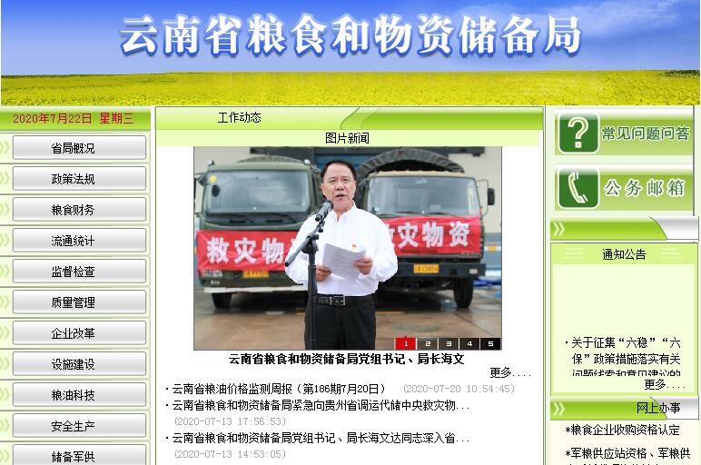 云南省粮食和物资储备局主要职责:(一)贯彻落实国家关于粮食流通和物资储备工作的法律法规和规章。拟订起草全省粮食流通和物资储备管理的地方性法规、政府规章草案和有关政策并监督执行。研究提出全省粮食流通和物资储备体制改革方案并组织实施。(二)承担全省粮食流通宏观调控的具体工作。研究提出粮食购销政策和最低收购价原则的建议并组织实施。指导协调政策性粮食购销和粮食产销合作。承担粮食监测预警和应急责任,负责全省粮食流通统计工作。承担全省军粮供应的相关工作。承担粮食安全行政首长责任制考核日常工作。(三)管理全省粮食、棉花、食糖等储备。负责省级储备粮棉糖行政管理。贯彻落实国家制定的粮棉糖仓储管理有关技术标准和规范,拟订省地方粮棉糖储备有关标准、技术规范并监督执行。(四)负责省级重要物资和应急储备物资的管理。研究提出省级重要物资储备规划、储备品种目录的建议。根据全省储备总体发展规划和品种目录,组织实施省级重要物资和应急储备物资的收储、轮换和日常管理,落实有关动用计划和指令。贯彻落实国家制定的物资储备仓储管理有关技术标准和规范,拟订省地方物资储备有关标准、技术规范并监督执行。监测重要物资供求变化并预测预警。承担省级物资储备单位安全生产的监管责任。(五)根据全省储备总体发展规划,统一负责储备基础设施建设和管理。拟订全省储备基础设施、粮食流通设施规划和全省粮食市场体系、粮食现代物流体系、粮食质量监测体系建设与发展规划并组织实施,管理有关储备基础设施、粮食流通设施、粮食现代物流体系和粮食质量监测体系国家和省投资项目。(六)负责对管理的政府储备、企业储备以及储备政策落实情况进行监督检查。负责粮食流通监督检查,负责粮食收购、储存、运输环节粮食质量安全、原粮卫生的监督管理,组织实施全省粮食库存检查工作。(七)负责粮食流通行业管理,制定行业发展规划、政策,拟订粮食流通和物资储备有关标准、粮食质量标准,制定有关技术规范并监督执行。负责粮食流通、加工行业安全生产的监督管理。负责粮食和物资储备的对外合作与交流。(八)完成省委、省政府交办的其他任务。