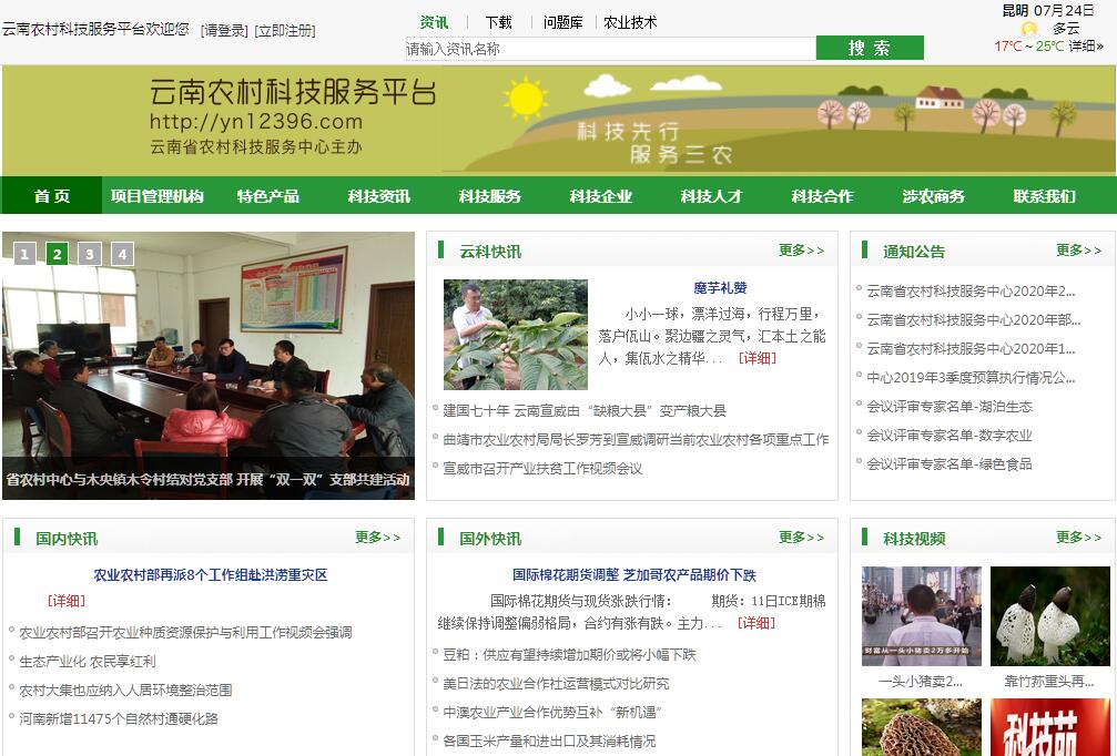 云南农村科技服务平台是云南省农村科技服务中心主办的致力于服务广大农户的公益性非营利平台 云南农村科技服务平台是在云南省科技厅的关心、指导下,由云南省农村科技服务中心主办建成,于2015年12月31日正式上线运行。平台以“科技先行,服务三农”为建站宗旨,现已开通“科技资讯、科技服务、科技企业、科技人才、科技合作、电子商务”等栏目,将为云南省范围内相关涉农政府部门、大专院校、科研院所,农业企业、协会、经济合作组织及农户,提供农业科技信息查询、技术指导等公益服务。云南省农村科技服务中心是云南省科技厅直属公益型事业单位,长期从事云南省的农业农村科技服务工作,以推进云南省农业农村科技进步为宗旨,在农业产业、农村经济等方面,深入开展多形式、多渠道、宽领域的科技服务,积极与全省各级相关行政管理部门、科研院所、大专院校合作,推动云南农业农村科技进步和经济繁荣,促进云南省广大农民增收致富。单位具体职能如下:1.以推动云南省农业农村科技进步为宗旨,研究“三农”科技发展状况、需求和相关政策规划,研究集成、示范、推广农业农村先进适用技术,促进成果转化。2.承担云南省科技厅农业领域、基础研究领域科技项目专业化管理工作,优化资源配置,建立专业化科技项目管理机制,提高项目管理水平和机构服务能力。3.建设云南农村科技服务平台,整合农业农村科技和人力资源,建设信息化服务系统,建立健全农村基层科技服务体系和机制,推动农村创新创业,促进农民增收。4.开展国内外农业科技交流与合作,促进技术转移,探索国际科技特派员服务机制,推动农业项目成果转化和产业化开发。