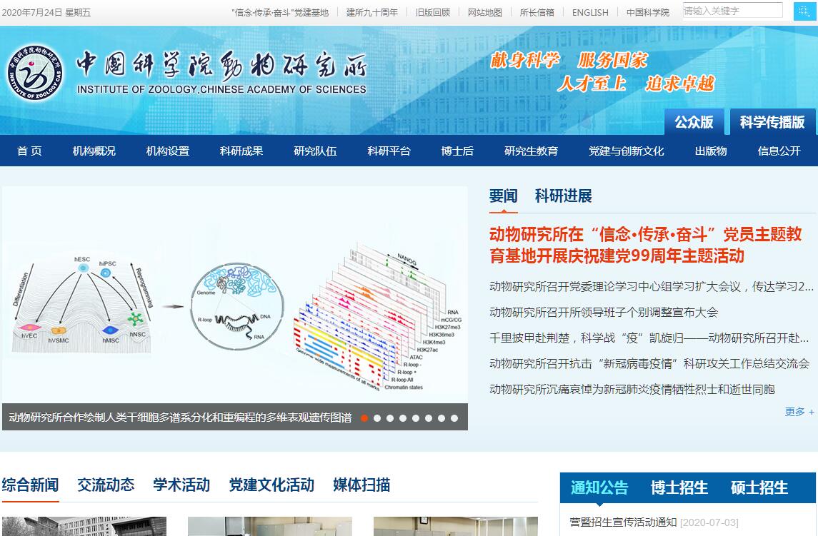 中国科学院动物研究所历史悠久,其前身是1928年成立的静生生物调查所、1929年成立的北平研究院动物学研究所和1930年成立的中央研究院动物研究所。1950年,中国科学院接收了上述三个研究所的部分资料、标本和设备,成立了中国科学院昆虫研究室和动物标本整理委员会。二者分别于1953年和1957年进一步发展为昆虫研究所和动物研究所,之后1962年两所合并成为现在的动物研究所。动物研究所曾产生过14位中国科学院学部委员(院士),在国家自然资源调查、自然保护区设立、虫鼠害防治、珍稀濒危动物保护、生殖避孕等领域做出过重要历史贡献。近年来,多位国家领导人和中国科学院及各部委领导到动物研究所视察工作,对研究所发展战略、学科目标凝练、园区建设、科研进展、人才培养等方面提出重要指示。动物研究所是以动物科学基础研究为主的社会公益型国家级科研机构。以野生动物和模式动物为研究对象,开展现代动物学研究,服务于人口健康、农业和生物多样性保护等国家重大需求。在细胞编程与重编程的机制、生殖与发育调控、生物灾害爆发机制与控制、物种濒危机制与保护等领域发挥引领作用;在动物分类与进化、农业虫鼠害防控和濒危动物保护中发挥不可替代的作用。动物研究所“一三五”战略规划目标包括三个重大突破和六个重点培育方向:三个重大突破:(一)干细胞与再生医学;(二)害虫害鼠行为调控;(三)动物进化与保护。六个重点培育方向:(一)生育力维持与生殖健康;(二)膜生物学与重大疾病;(三)有害生物成灾机制与防控;(四)物种的濒危机制与保护;(五)动物多样性格局形成与演化机制;(六)人类疾病动物模型的创制。2012-2016年,动物研究所作为第一完成单位发表SCI论文1305篇,其中在TOP15%期刊发表论文532篇,占总论文数量的40.8%;在IF≧5期刊发表论文353篇,占总论文数量的27.1%。5年来,动物研究所获国家自然科学二等奖1项、国家科技进步二等奖1项,省部级科技奖励10项。近年来,动物研究所国际学术交流活动日益频繁。2014-2018年,共有来自美国、加拿大、德国、新西兰、巴基斯坦等国家的30余位优秀外籍科学家到所工作。动物研究所共举办各领域国际会议、国际培训班20余个,共承担各类国际合作项目40项。动物研究所现有六个中外联合研究中心,分别是:中法哺乳动物胚胎细胞生物学联合实验室、中美野生动物疫病研究中心、计算和进化生物学研究中心、中澳分类学虚拟实验室、细胞治疗国际联合研究中心和生物复杂性研究联合实验室。国际动物学会(International Society of Zoological Sciences)秘书处挂靠在动物研究所。动物研究所主办的学术刊物有7种,分别是《Current Zoology》、《Insect Science》、《Integrative Zoology》、《昆虫学报》、《动物分类学报》、《动物学杂志》、《应用昆虫学报》,其中《Current Zoology》、《Insect Science》、《Integrative Zoology》是SCI收录的期刊,其影响因子依次为1.594、2.144和1.904。其他 4 种刊物为我国自然科学的核心期刊。自 2002 年起,动物研究所出版内部刊物《动物研究所所刊》。动物研究所在科学普及教育和科学研究领域发挥重要作用,在普及科学知识、传播先进文化、弘扬科学精神和倡导科学思维等方面,成为我国现代科学文明与创新文化的重要源泉和基地。国家动物博物馆曾先后被授予“全国科普教育基地”、“北京市社会大课堂资源单位”、“首批全国中小学科普教育社会实践基地”、“北京市第一次全国可移动文物普查先进集体”等荣誉称号。