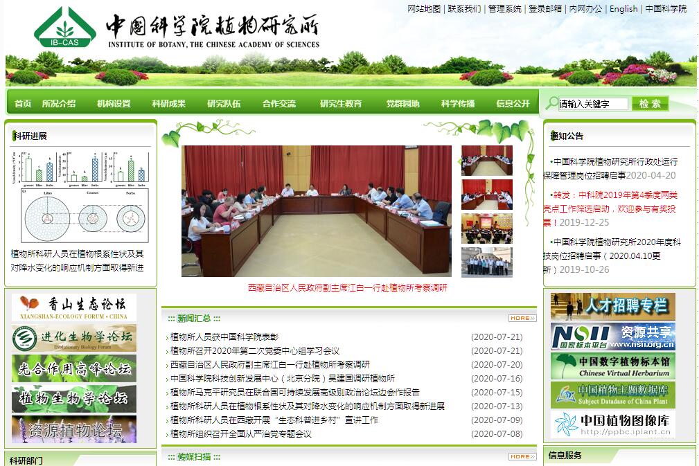 中国科学院植物研究所地处美丽的北京香山脚下,有着90年的建所历史,是我国植物科学的综合研究机构,先后获得国家自然科学奖一等奖3项,其他国家级、中科院和省部级科研成果奖134项。 “十三五”期间,植物所以“世界上有重要影响的一流研究机构”为发展目标,以“整合植物学”为学科定位,紧紧围绕植物学科发展以及国家对生态文明建设和农业转型发展的战略需求,植物系统与进化、生态环境、分子生理与发育、光合作用、资源植物可持续利用5个重点学科领域,力争在植物多样性格局与形成机制的若干重大基础和前沿问题、作物种子优质高产的分子机理、草地保护及可持续利用的理论体系与技术集成3个方面实现重大突破,引领和推动我国现代植物科学的持续发展。植物所现有7个研究和支撑部门、8个野外台站、1个亚洲最大的植物标本馆、1个公共技术服务中心和中国生态系统研究网络(CERN)生物分中心。研究和支撑部门包括2个国家重点实验室(系统与进化植物学国家重点实验室、植被与环境变化国家重点实验室)、3个中国科学院重点实验室(中科院植物分子生理学重点实验室、中科院光生物学重点实验室、中科院北方资源植物重点实验室)、北京植物园(含华西亚高山植物园)、文献与信息管理中心。中科院内蒙古草业研究中心依托于植物所。植物所作为我国首批具有博士、硕士学位授予权的单位之一,设有植物学、发育生物学、生态学、细胞生物学、生物工程硕士学位授予点,植物学、发育生物学、生态学、细胞生物学博士学位授予点,并设有生物学、生态学专业一级学科博士后流动站,已培养博士、硕士研究生2,600余人。植物所是中国植物学会、北京生态学学会、中国花卉协会蕨类植物分会和Journal of Plant Physiology中国编辑部的挂靠单位。主办的刊物有:Journal of Integrative Plant Biology、Journal of Plant Ecology、Journal of Systematics and Evolution、《植物生态学报》、《生物多样性》、《植物学报》、《生命世界》,其中前3个被SCI收录。