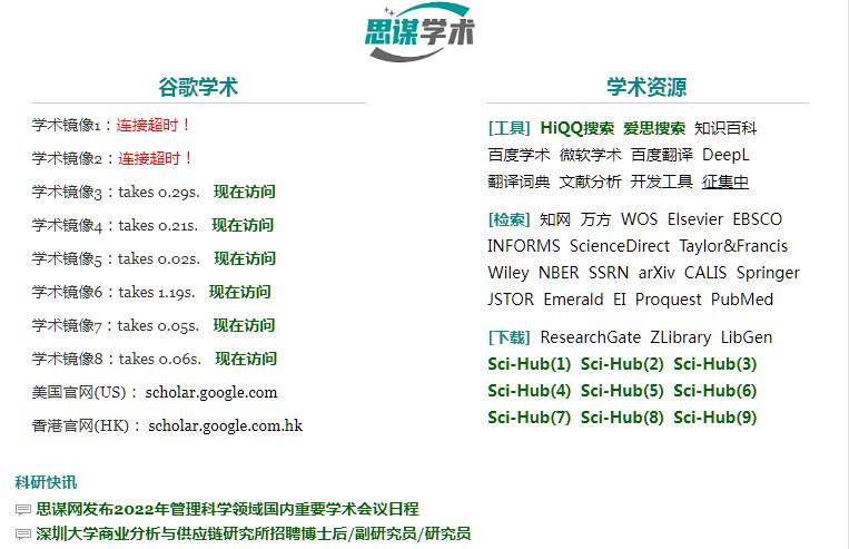 | 网站简介: 思谋学术:为科研工作者提供谷歌学术和网页搜索的网站导航,自动检测和更新可以访问的谷歌学术网址,并提供学术论文的Sci-Hub免费下载通道。 |