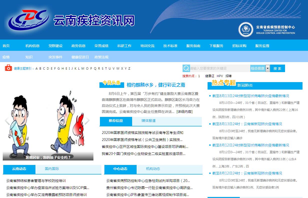 云南疾控资讯网由云南省疾病预防控制中心主办。云南省疾病预防控制中心成立于2001年,由原省卫生防疫站、省职业病防治研究所、省结核病防治所、省皮肤病防治研究所4个单位合并组建而成,是政府实施疾病预防控制与公共卫生技术管理和服务的公益事业单位,是云南省疾病预防控制及公共卫生技术管理指导中心。省疾控中心业务用房14184平方米,实验室面积5440平方米,拥有百级、万级和十万级净化实验室50余间。拥有283平方米的生物安全三级实验室(p3实验室)和324平方米的动物房。拥有包括各类高精尖仪器的检测检验设备5041台(件),设备总值1.63亿元,设备能力达到国家a级标准的95%。可开展sars、高致病性禽流感、埃博拉出血热等病原微生物检测和理化、毒理学、微生物、临床等检验项目。在理化、微生物、毒理、疾病等领域的25大类1103项检验能力通过国家实验室认可和计量认证。2015年通过“iso9001质量管理体系"认证。具有省(部)级以上资质32个,包括“合格脊髓灰质炎实验室"“流感检测实验室"“麻疹检测实验室"等who认证实验室3个;国家“两认"实验室、生物安全三级实验室、高致病性病原微生物实验室、食品安全定点检测机构、职业卫生技术服务机构甲级资质、埃博拉实验室活动资格等国家认证实验室及资质18项。建设有“院士工作站"“博士后工作站",现为昆明医科大学、大理大学、楚雄医高专等高校的教学实习基地。承担国家“十五"“十一五"“十二五"“十三五"重大科技攻关项目,获得科技成果奖59项,其中省部级以上18项,其他41项。多年以来,在国家卫生计生委、省委省政府和省卫生计生委的领导下,为全省疾病防控,保障人民健康,维护社会稳定发挥积极作用。全省传染病防控成效明显,甲乙类传染病发病率连续十四年(2004-2017年)低于全国平均水平;有效防控非典、人感染高致病性禽流感、中东呼吸综合征等疫情;成功处置鼠疫、霍乱、职业中毒等重大突发公共卫生事件;艾滋病、结核病等重点传染病防控取得突破;主动投身国内外地震灾害医疗防疫,实现大灾之后无大疫;多次代表国家参与国际性的卫生保障及跨境救援,先后赴尼泊尔执行灾后卫生防疫及医疗救治,派出专家赴非洲开展埃博拉出血热援外防控,赴缅甸开展洪灾后医疗防疫救援。先后获得全国卫生计生系统先进集体、全国“五一"劳动奖状、全国疾病预防控制先进集体、全国卫生应急先进集体、全国艾滋病防治工作先进集体、全国防治非典型肺炎先进基层党组织、百家全国卫生系统思想政治工作先进单位、全国政促会疾控分会思想政治工作先进单位、全国青年文明号等集体荣誉。中心职工也先后获得全国、全省劳动模范、全国“三八"红旗手、全省“五一劳动奖章"、“兴滇人才"、“云岭名医"等荣誉称号。