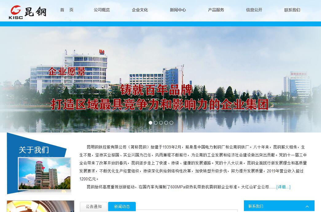 昆明钢铁控股有限公司(简称昆钢)始建于1939年2月,前身是中国电力制钢厂和云南钢铁厂。八十年来,昆钢薪火相传,生生不息,坚持实业报国、实业兴国为己任,风雨兼程不断前行,为云南的工业发展和经济社会建设做出突出贡献。党的十一届三中全会带来了改革开放的春风,昆钢逐步走上了快速、持续、健康的发展道路。党的十八大以来,昆钢全面践行新发展理念和高质量发展要求,不断优化生产经营组织,持续深化供给侧结构性改革,加快转型升级步伐,努力提升发展质量,2019年营业收入超过1200亿元。昆钢始终高度重视创新驱动,在国内率先编制了600MPa级热轧带肋抗震钢筋企业标准。大红山矿业公司获评全国冶金矿山“十佳厂矿”。“昆钢牌”商标被认定为全国驰名商标。管道运输技术获得国家科技进步二等奖,面向南亚东南亚的物流网络基础基本形成。“钢钛结合”生产模式,生产出中国第一卷钛带卷,引进吸收研发拥有自主知识产权的国产化EB炉,承担了国家重点科研项目和国防科工局项目。昆钢先后荣获“全国五一劳动奖状”“全国冶金行业服务质量十佳企业”“全国用户满意企业”“全国质量效益性企业”“中国企业信息化百强企业”“全国和谐劳动关系模范企业”“全国企业文化建设先进单位”、“全国绿化先进单位”“全国民族团结进步模范单位”等荣誉称号。面向新时代,昆钢将秉持“传承匠心、创新超越、开放共赢”的企业精神,展现新作为,不断深化改革,持续创新转型,主动服务和融入国家“一带一路”建设,按照“做优钢铁产业链、做强物流服务网、做好产城生态圈”发展战略,以产业转型和管理转型为突破方向,突出主业,聚力打造钢铁及延伸加工、现代物流两大支柱产业,实施本部搬迁及改造、昆焦转型三大转型项目,着力培育大健康新兴产业,积极开展全方位合作,坚持绿色发展,加快“走出去”步伐,从钢铁产业的“先行者”向美好生活的“智造者”转变,铸就百年品牌,打造区域最具竞争力和影响力的企业集团。经过八十年的风雨历程,站在铸就百年品牌的新起点,我们衷心的感谢各级党委政府和社会各界一直以来对昆钢发展的关心和支持!开启新征程,我们愿与社会各界携手并肩,坚持互利共赢开放的原则,共享发展机遇,共创美好未来!
