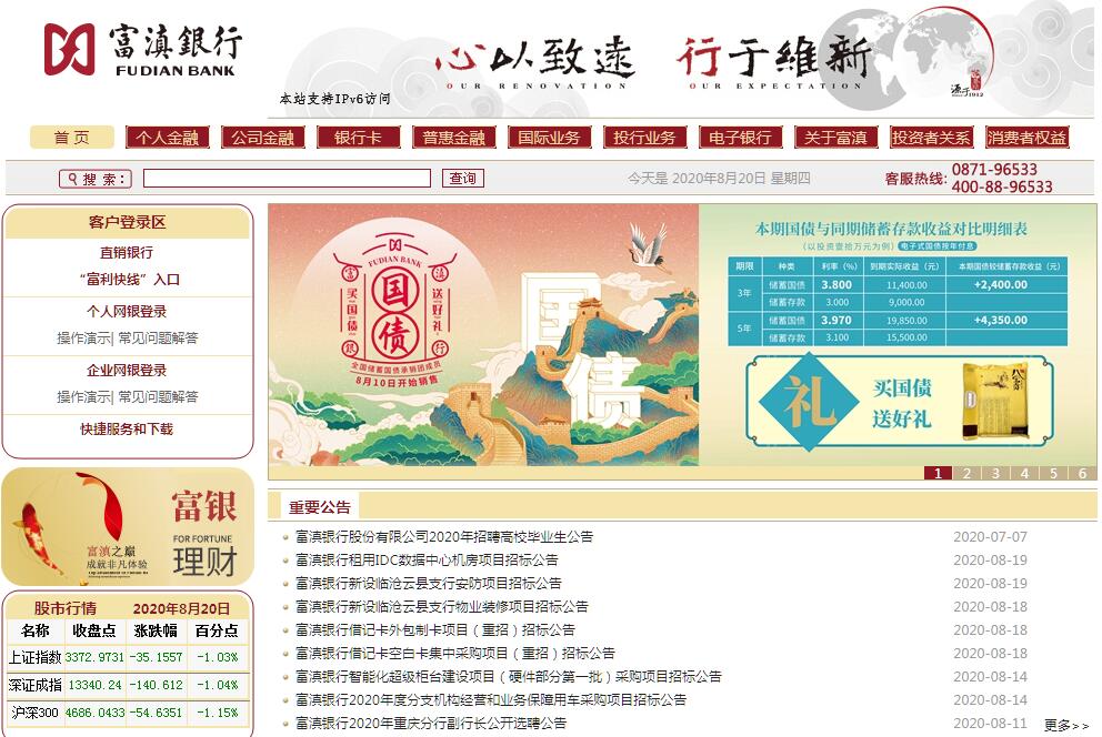 富滇银行品牌创立于1912年,是拥有百年历史的老字号银行品牌。历史上的富滇银行声名远扬海内外,发行滇币调控云南金融,是全球第六大华资银行,创造了一段辉煌的金融史。2007年12月30日,富滇银行股份有限公司经中国银监会批准恢复成立,成为云南省首家省级地方性股份制商业银行。在省委、省政府的坚强领导下,在主管监管单位和社会各界的指导支持下,富滇银行依托百年金融品牌底蕴,主动服务和融入“一带一路”、长江经济带建设,综合实力不断壮大,品牌影响持续提升,差异化特色化经营能力稳步增强。目前150家营业机构遍布云南省15个州市和重庆市,发起设立4家村镇银行,与老挝外贸大众银行合资设立老中银行,是全国唯一在境外设立子行的城商行。2019年是新中国成立70周年,富滇银行将高举习近平新时代中国特色社会主义思想伟大旗帜,以发展为第一要务,以人才为第一资源,以创新为第一动力,深入贯彻落实党的十九大、中央经济工作会议、全国金融工作会议精神,聚焦绿色金融、旅游金融、跨境金融、普惠金融、数字金融五大特色业务,从防范化解风险、提升资产质量中激发增长活力,从融入国家战略、服务实体经济中拓展市场空间,从深化国企改革、加快战略转型中增强发展动能,全面赋能高质量跨越式发展,加快建设成为现代化、国际化、公众化的新型股份制商业银行。