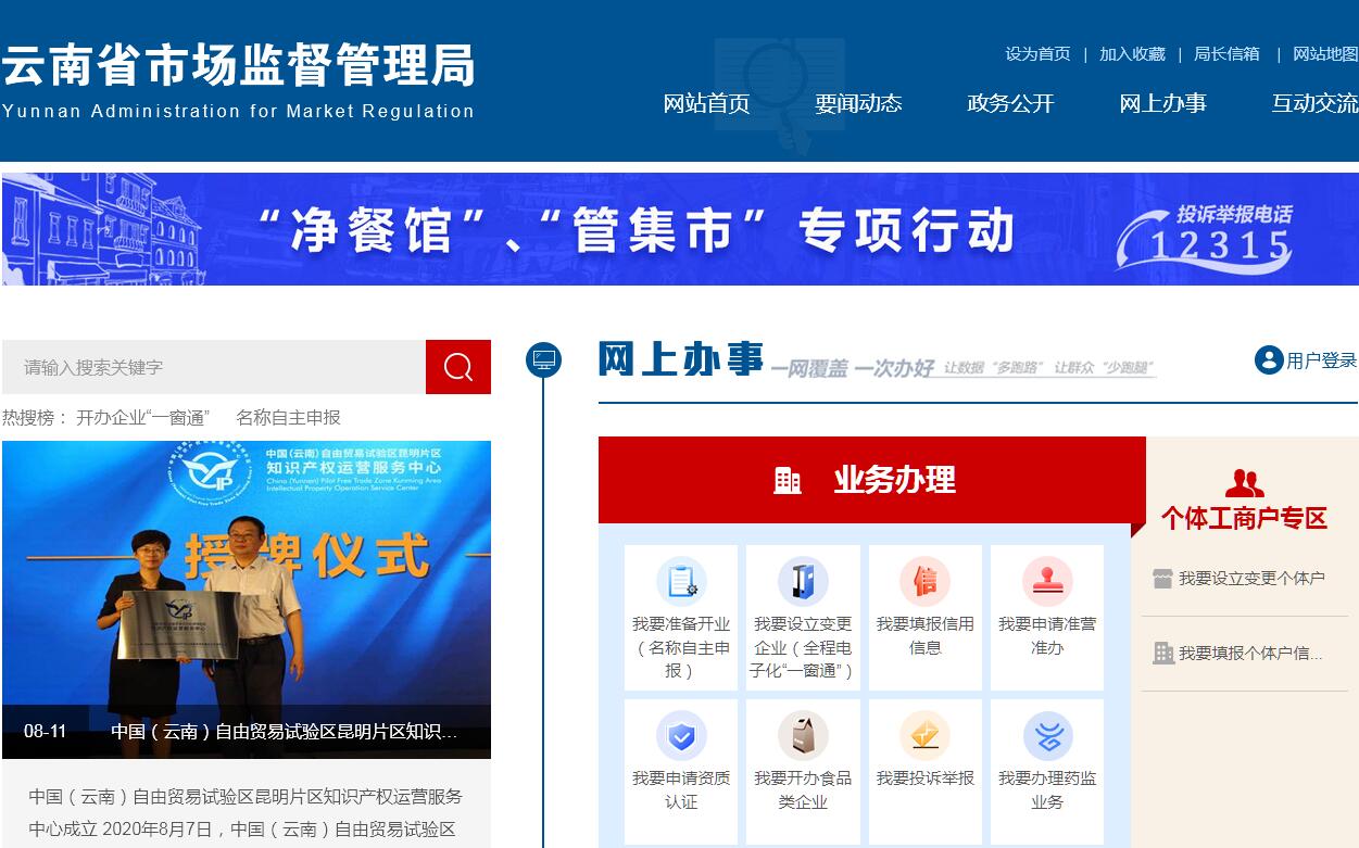 云南省市场监督管理局主要职责:(一)负责市场综合监督管理。起草市场监督管理有关地方性法规、政府规章草案,制定有关政策、标准,组织实施质量强省战略、食品安全战略和标准化战略。拟订并组织实施有关规划,规范和维护市场秩序,营造诚实守信、公平竞争的市场环境。(二)负责市场主体统一登记注册。组织指导全省各类企业、农民专业合作社和从事经营活动的单位、个体工商户以及外国(地区)企业常驻代表机构等市场主体的登记注册工作。建立市场主体信息公示和共享机制,依法公示和共享有关信息,加强信用监管,推动市场主体信用体系建设。(三)负责组织和指导市场监督管理综合执法工作。指导全省市场监督管理综合执法队伍整合和建设,推动实行统一的市场监督管理。组织查处和督办重大违法案件。规范市场监督管理行政执法行为。(四)负责反垄断统一执法。统筹推进竞争政策实施,指导实施公平竞争审查制度。根据授权承担垄断协议、滥用市场支配地位、经营者集中行为和滥用行政权力排除、限制竞争等反垄断执法工作。(五)负责监督管理市场秩序。依法监督管理市场交易、网络商品交易及有关服务行为。组织指导查处价格收费违法违规、不正当竞争、违法直销、传销、侵犯商标专利知识产权和制售假冒伪劣商品违法行为。指导广告业发展,监督管理广告活动。指导查处无照生产经营和有关无证生产经营行为。指导省消费者协会开展消费维权工作。(六)负责宏观质量管理。拟订并组织实施质量发展的制度措施,统筹省质量基础设施建设与应用,会同有关部门组织实施重大工程设备质量监理制度,组织重大产品质量事故调查,组织实施缺陷产品召回工作,监督管理产品防伪工作。(七)负责产品质量安全监督管理。承担产品质量安全风险监控和监督抽查工作。组织实施质量分级制度、质量安全追溯制度。负责纤维质量监督工作。负责工业产品生产许可管理。(八)负责特种设备安全监督管理。综合管理特种设备安全监察、监督工作,监督检查高耗能特种设备节能标准和锅炉环境保护标准的执行情况。(九)负责食品安全监督管理综合协调。统筹指导全省食品安全工作。组织制定全省食品安全重大政策并组织实施。负责食品安全应急体系建设,组织协调重大食品安全事件应急处置和调查处理工作。建立健全食品安全重要信息直报制度。承担云南省人民政府食品安全委员会日常工作。(十)负责食品安全监督管理。建立覆盖食品生产、流通、餐饮、消费全过程的监督检查制度和隐患排查治理机制并组织实施,防范区域性、系统性食品安全风险。推动建立食品生产经营者落实主体责任的机制,健全食品安全追溯体系。组织开展食品安全监督抽检、风险监测、核查处置和风险预警、风险交流工作。组织实施特殊食品注册、备案和监督管理。(十一)负责统一管理计量工作。推行法定计量单位,执行国家计量制度,管理计量器具及量值传递溯源和计量比对工作。规范、监督商品量和市场计量行为。(十二)负责统一管理标准化工作。依法承担地方标准的立项、编号和发布工作。组织制定并实施标准化激励政策,依法协调指导和监督地方标准、团体标准制修订工作和标准化工作。(十三)负责统一管理检验检测工作。推进检验检测机构改革,规范检验检测市场,完善检验检测体系,指导协调检验检测行业发展。(十四)负责统一管理、监督和综合协调全省认证认可工作。组织实施国家统一的认证认可和合格评定监督管理制度。(十五)负责知识产权管理工作。拟订和组织实施知识产权战略。负责保护知识产权,统筹指导知识产权保护体系建设。承担职责范围内的知识产权行政裁决。促进知识产权运用,统筹指导知识产权公共服务体系建设。(十六)负责市场监督管理科技和信息化建设、新闻宣传、对外交流与合作。按规定承担技术性贸易措施有关工作。(十七)管理云南省药品监督管理局。(十八)完成省委、省政府交办的其他任务。