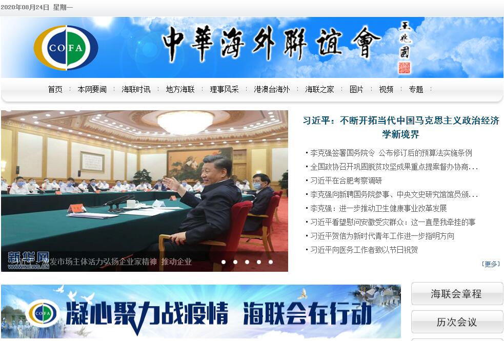 | 网站简介: 中华海外联谊会由中国大陆各界代表人士及有关团体、香港特别行政区同胞、澳门特别行政区同胞、台湾同胞和海外侨胞中的知名人士自愿结成,是具有独立法人地位的全国性、联谊性、非营利性社会团体。本会的任务:促进祖国的改革开放和现代化建设,维护港澳的长期稳定繁荣和发展,推进祖国的和平统一,增进中国人民与世界各国人民的友谊。(一)积极促进祖国大陆各界与香港同胞、澳门同胞、台湾同胞和海外侨胞的联系,加强沟通,扩大交流与合作,协助维护其合法权益;(二)积极引导香港同胞、澳门同胞全面准确贯彻“一国两制”方针和基本法,支持特区政府和行政长官依法施政,主动融入国家发展大局,发展壮大爱国爱港爱澳力量,增强国家意识和爱国精神;(三)积极引导台湾同胞坚持一个中国原则,促进同胞心灵契合,推动两岸关系和平发展,推进祖国和平统一进程;(四)积极引导海外侨胞构建和谐侨社,弘扬中华文化,与当地人民和睦相处,以侨为桥,促进中外友好交流与合作。 |