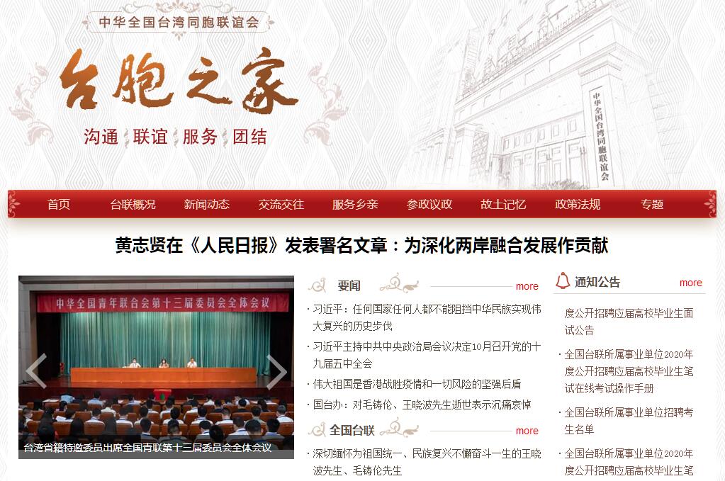中华全国台湾同胞联谊会(简称全国台联)于1981年12月22日在北京成立,是台湾各族同胞的爱国民众团体。全国台联是台湾各族同胞的爱国民众团体,是党和政府联系台湾同胞的桥梁和纽带。其宗旨继承和发扬台湾同胞光荣的爱国爱乡传统,高举社会主义、爱国主义旗帜,牢牢把握两岸关系和平发展主题,密切联系居住在祖国大陆的台湾同胞;在爱国统一的旗帜下,广泛团结联络台湾岛内、港澳和海外的台湾同胞,同心同德,为增进乡亲情谊和台湾人民福祉,为推动两岸关系和平稳定发展,为按照“和平统一、一国两制”的方针实现祖国统一,为振兴中华、促进中华民族大团结而贡献力量 全国台联团结依靠定居祖国大陆的台湾同胞,协助他们了解政府的方针政策和台湾局势;鼓励他们充分发挥聪明才智,积极参政议政,为祖国统一和中国特色社会主义建设多做贡献;了解和反映他们的意见和要求,配合有关部门按照法律和政策妥善处理。关心和协助定居祖国大陆的台湾同胞返乡探亲、扫墓、访友、定居和进行经济、科技、文化、学术、体育等交流。全国台联加强与台湾岛内同胞的联系,倾听和反映他们的意见和要求,充分理解他们当家作主的愿望,维护他们的正当权益,积极发挥桥梁和纽带作用。密切联系常住祖国大陆的台湾同胞,帮助他们了解和理解祖国大陆的法律法规和有关方针政策,协助他们在祖国大陆投资、求学、就业、兴办公益慈善事业,认真听取和反映他们的意见和建议,维护他们的合法权益。全国台联发展同香港、澳门及旅居海外的台湾同胞及其社会团体的联谊关系,相互沟通,增进共识。目前,祖国大陆除西藏以外的31个省、自治区、直辖市(含兵团)和台胞比较集中的地、市和县都已建立了地方台联。随着海峡两岸往来的日益增多,作为台胞之家的台联将一如既往热情周到地为台湾同胞服务。