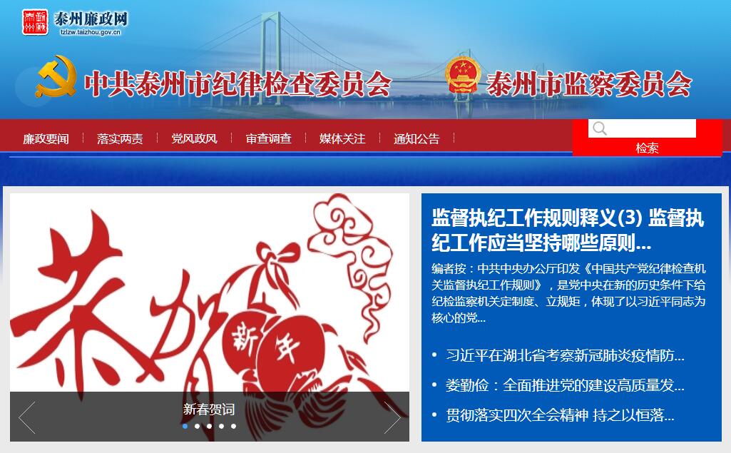 | 网站简介: 泰州廉政网由中共泰州市纪律检查委员会、泰州市监察委员会主办。泰州市监察委员会是由泰州市人民代表大会选举产生,并向泰州市人民代表大会负责的国家监察机关。在各省、自治区、直辖市、自治州、县、自治县、市、市辖区设立监察委员会,行使监察职权。将县级以上地方各级人民政府的监察厅(局)、预防腐败局和人民检察院查处贪污贿赂、失职渎职以及预防职务犯罪等部门的相关职能整合至监察委员会。监察委员会主任由本级人民代表大会选举产生;监察委员会副主任、委员,由监察委员会主任提请本级人民代表大会常务委员会任免。监察委员会对本级人民代表大会及其常务委员会和上一级监察委员会负责,并接受监督。 |