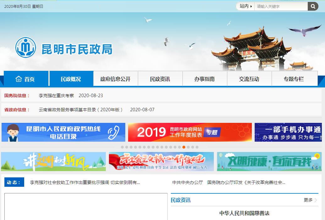 昆明市民政局主要职责:(一)贯彻执行党和国家、省委和省政府关于民政工作的方针、政策和法律、法规;根据昆明市经济和社会发展规划,制定全市民政事业发展规划,起草有关地方性法规和政府规章草案,制定部门规范性文件和年度工作计划,并组织实施和监督检查;负责本行业领域的安全生产工作。(二)贯彻执行国家和省、市关于社会团体、基金会、社会服务机构等社会组织的登记和监督管理办法;依法对全市及跨县(市)区社会团体、基金会、社会服务机构等社会组织进行登记管理和执法监督,指导各县(市)区社会团体、基金会、社会服务机构等社会组织的登记管理和执法监督工作;指导所属新经济组织、新社会组织(以下简称“两新”组织)抓好党的建设工作。(三)贯彻执行国家和省、市关于社会救助的发展规划、政策,健全城乡社会救助体系;承担城乡居民最低生活保障、特困人员救助供养、临时救助、生活无着流浪乞讨人员的救助工作。(四)贯彻执行国家和省、市关于加强和改进城乡基层政权建设及社区治理的政策;牵头协调城乡基层群众自治建设和社区治理工作,指导城乡社区治理体系和治理能力建设,提出加强和改进城乡基层政权建设的建议;指导村(居)民委员会的民主选举、民主决策、民主管理和民主监督工作;负责村(居)务公开、基层民主政治建设和基层政权建设工作。(五)贯彻执行国家和省、市关于行政区划、行政区域界线管理及地名管理的政策和办法;负责全市行政区划调整的调研工作;负责需报市政府研究审定的行政区划设立、撤销、命名、变更和政府驻地迁移报批工作,按程序上报国务院和省人民政府审批;负责行政区域界线的管理和维护,调处边界纠纷;负责地名档案资料的收集管理工作,指导各县(市)区开展区划地名工作;承办勘界事宜;负责全市重要自然地理实体的命名、更名审核工作。(六)贯彻执行国家和省、市关于婚姻管理的政策,推进婚俗改革。(七)贯彻执行国家和省、市关于殡葬管理的政策、服务规范,推进殡葬改革。(八)统筹推进、督促指导、监督管理全市养老服务工作,拟定全市养老服务体系建设规划、政策、标准并组织实施;承担老年人福利和特殊困难老年人救助工作;指导各县(市)区养老服务、老年人福利、特困人员救助供养机构管理工作。(九)贯彻执行国家和省、市关于残疾人权益保护的政策,协调推进残疾人福利制度建设和康复辅助器具产业发展。(十)贯彻执行国家和省、市关于儿童福利、孤弃儿童保障、儿童收养、儿童救助保护的政策;健全农村留守儿童关爱服务体系和困境儿童保障制度;指导各县(市)区儿童福利、收养登记、救助保护机构管理工作。(十一)贯彻执行促进慈善事业发展政策,指导社会捐助工作,负责全市福利彩票管理工作。(十二)贯彻执行社会工作、志愿服务的政策,会同有关部门推进社会工作人才队伍建设和志愿者队伍建设。(十三)完成市委、市政府和上级机关交办的其他任务。