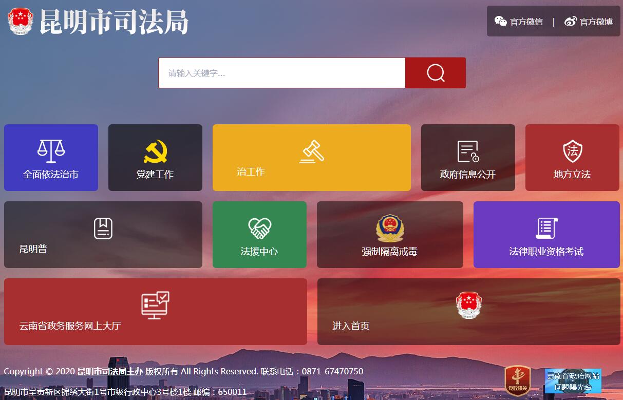 昆明市司法局主要职责:(一)承担全面依法治市重大问题的政策研究,协调有关方面提出全面依法治市中长期规划建议,负责有关重大决策部署督察工作。(二)承担统筹规划立法工作的责任。拟定市政府中长期立法规划和年度立法工作计划,负责跟踪了解各部门对立法工作计划的落实情况,研究提出立法与改革决策相衔接的意见、措施。负责面向社会征集地方性法规、市政府规章制定项目建议。(三)负责起草或者组织起草重要地方性法规和市政府规章草案。负责立法协调。(四)承办市政府规章的审查、备案、解释、立法后评估工作。负责协调实施市政府规章中的有关争议和问题。承办市政府规章的清理、编纂、译审工作。(五)承担统筹推进法治政府建设的责任。指导、监督市政府各部门、各县(市)区人民政府依法行政工作。负责综合协调行政执法,承担推进行政执法体制改革有关工作。指导、监督全市行政复议、行政应诉和行政赔偿工作。负责市政府的行政复议和应诉案件的办理工作。负责市政府重大行政决策法律审查(审核)及其他法律顾问事务,指导市政府各部门和县(市)区政府的法律顾问工作。(六)承担统筹规划法治社会建设的责任。负责拟定法治宣传教育规划,组织实施普法宣传工作。推动人民参与和促进法治建设。指导、监督依法治理和法治创建工作。指导调解工作。指导、监督人民陪审员、人民监督员的选任管理工作,推进司法所建设。(七)指导、管理社区矫正工作。指导刑满释放人员安置帮教工作。(八)管理市强制隔离戒毒所。指导、监督强制隔离戒毒执行和戒毒康复工作。对社区戒毒和社区康复工作提供指导、支持和协助。(九)负责拟定全市公共法律服务体系建设规划并指导实施,统筹和布局城乡、区域法律服务资源。指导、管理律师、法律援助、司法鉴定、公证、仲裁和基层法律服务工作。(十)负责全市国家统一法律职业资格考试的组织实施工作。负责全市国家统一法律职业资格审核和证书发放工作。(十一)负责本系统服装和警车管理工作,指导、监督本系统财务、装备、设施、场所等保障工作。负责本系统的内部审计工作。(十二)承担本系统信息化建设和有关外事工作。(十三)规划、协调、指导法治人才队伍建设相关工作,指导、监督本系统队伍建设。负责本系统警务管理和警务督察工作。协调县(市)区管理司法局领导干部。(十四)完成市委、市政府和上级部门交办的其他任务。