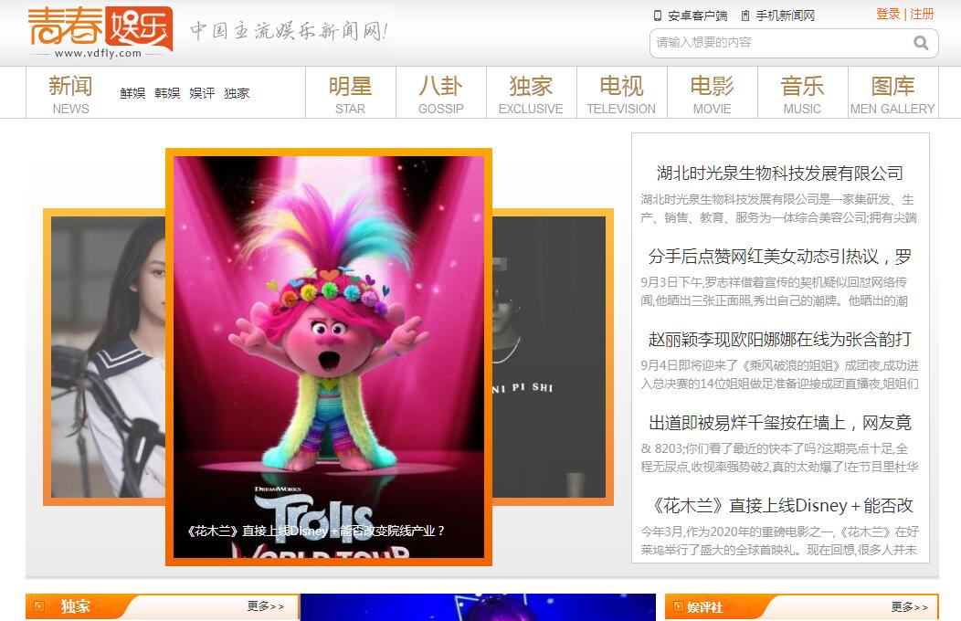 | 网站简介: 青春娱乐新闻网—发掘娱乐潜能,制造主流热点,紧跟时尚潮流,打造网娱航母,立志成为中国最具活力与影响力的娱乐新闻媒体。 |