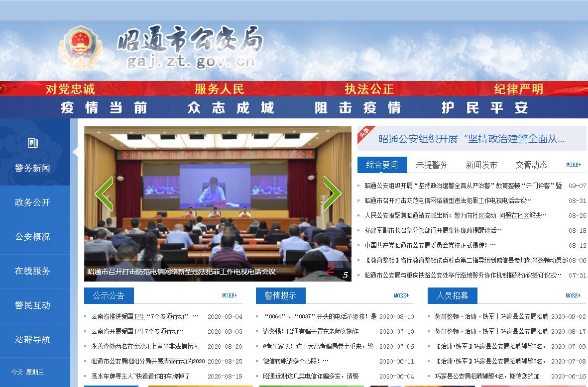 昭通市公安局是昭通市人民政府主管全市公安工作的职能部门,在市委、市政府和上级公安机关的领导下,依法履行以下职责:一、根据国家公安工作的方针、政策和部署,结合我市实际,研究制定我市公安工作的目标、任务和措施,指导、监督、检查全市公安工作。二、组织、指导刑事案件侦查工作,协调侦办重大刑事案件。三、组织、指导全市公安机关依法查处危害社会治安秩序行为,依法管理特种行业等。四、组织指导全市各地公安机关依法管理中国公民出入境和外国人在我市境内居留、旅行等工作。五、指导、监督全市各地公安消防工作。六、指导全市各地公安机关维护道路交通安全、交通秩序以及机动车辆和驾驶人管理工作。七、指导全市各地公安机关对国家机关、社会团体、企事业单位和重点建设工程的治安保卫工作以及群众性治安保卫组织的治安防范工作。八、指导、监督全市公安机关对公共信息网络的安全监察工作。九、指导、监督全市公安机关依法承担的执行刑罚和对看守所、行政拘留所的管理工作。十、组织、指导全市公安科学技术工作。十一、组织、指导全市公安机关装备、被装配备、经费和信息通信保障。十二、统一领导全市公安消防部队建设。按规定的权限,对武警昭通市支队执行公安任务进行领导和指挥。十三、 组织、指导全市公安队伍建设和公安宣传工作。十四、承办市委、市政府和上级公安机关交办的其他事项。