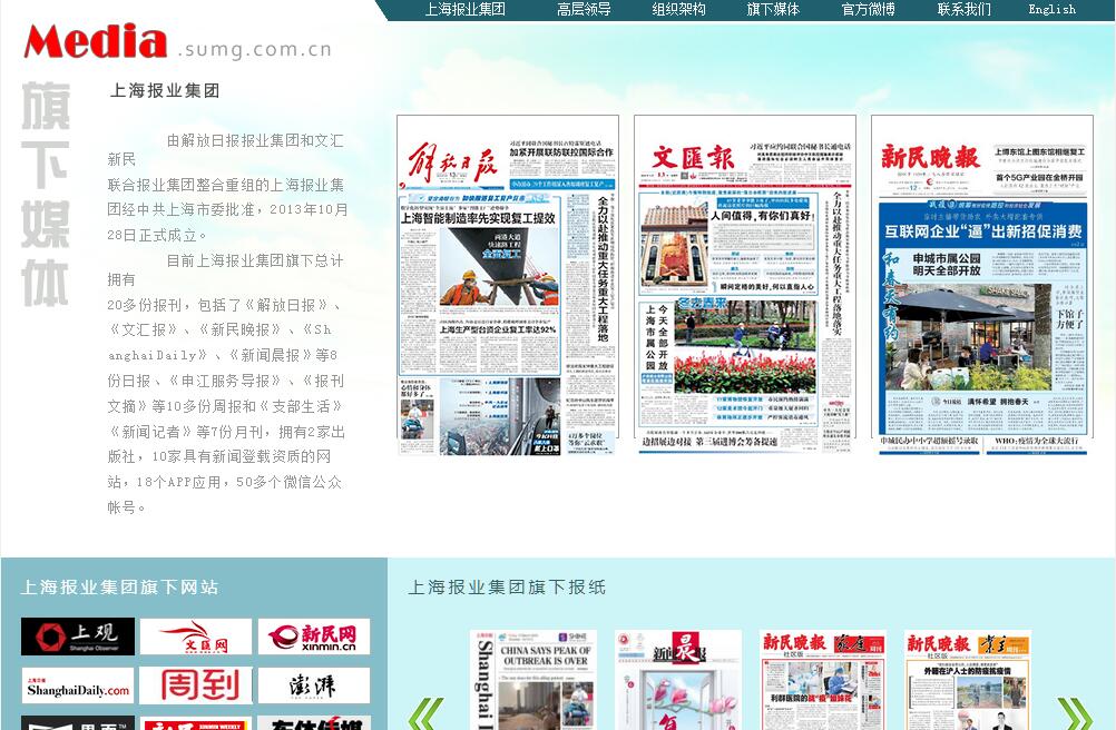| 网站简介: 文新传媒(上海报业集团)由解放日报报业集团和文汇新民联合报业集团整合重组的上海报业集团经中共上海市委批准,2013年10月28日正式成立。目前上海报业集团旗下总计拥有20多份报刊,包括了《解放日报》、《文汇报》、《新民晚报》、《ShanghaiDaily》、《新闻晨报》等8份日报、《申江服务导报》、《报刊文摘》等10多份周报和《支部生活》《新闻记者》等7份月刊,拥有2家出版社,10家具有新闻登载资质的网站,18个APP应用,50多个微信公众帐号。 |
