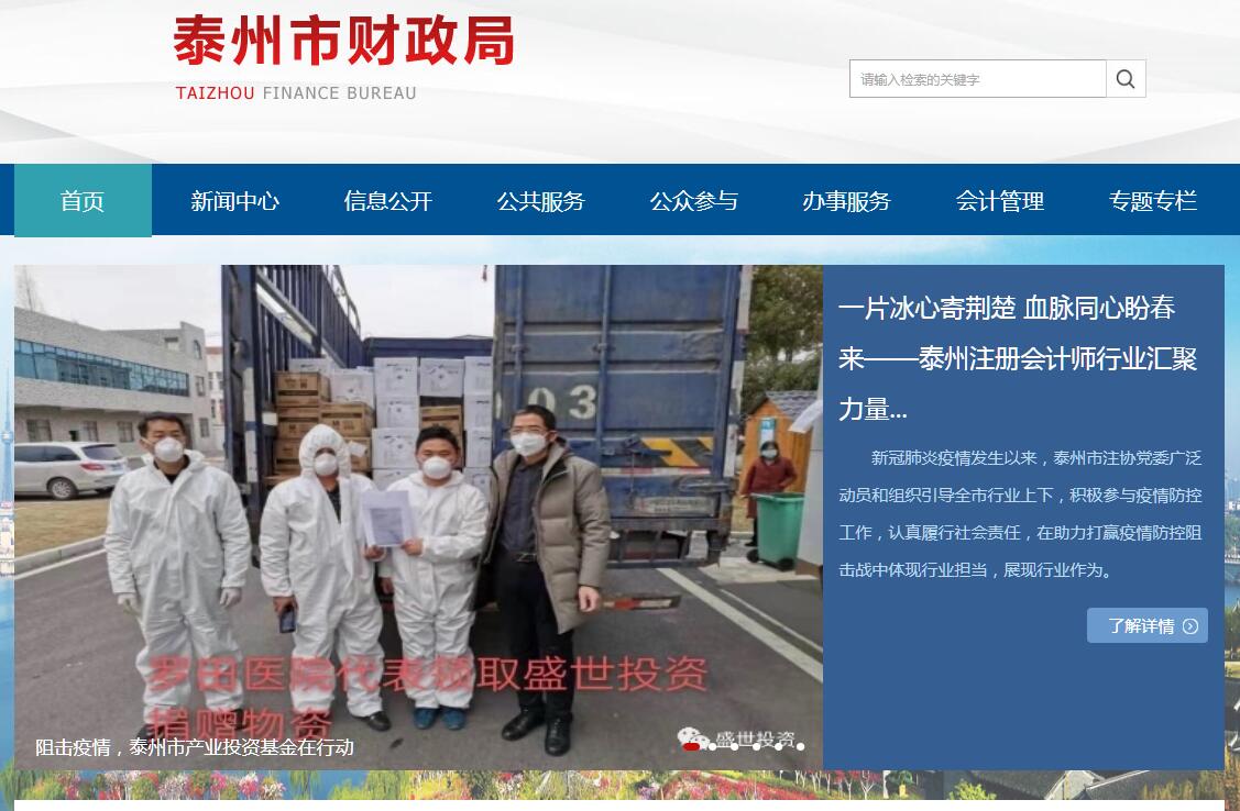 泰州市财政局主要职责 :(一)切实履行宏观调控职责,参与制定各项宏观经济政策,提出运用财税政策实施宏观调控、促进经济发展方式转变、综合平衡社会财力、促进区域协调发展和推进基本公共服务均等化及主体功能区建设的建议。拟订和执行市与区、国家与企业的分配政策,完善鼓励公益事业发展的财税政策。(二)贯彻执行国家和省、市有关财政、税收方针政策及法律法规,拟订和执行全市财政、税收发展战略、政策、中长期规划、改革方案及其他有关政策;改革完善市对区财政管理体制,指导市区财政部门开展业务工作。(三)拟订和执行财政、财务、会计、政府采购、国有资产管理的规范性文件。(四)承担市级各项财政收支管理的责任。负责编制年度市级预决算草案并组织执行;受市政府委托,向市人民代表大会报告市级和全市年度预算及其执行情况,向市人大常委会报告决算;组织制定市本级经费开支标准、定额,负责审核批复部门(单位)的年度预决算。(五)研究建立预算绩效评价体系和科学合理的财政资金绩效管理机制,负责制定财政资金绩效管理工作的有关政策、制度和实施办法,组织开展财政资金绩效管理和财政支出绩效评价工作。(六)负责政府非税收入管理,按规定管理政府性基金、行政事业性收费和其他非税收入;负责政府性基金预算编制和管理工作;管理财政票据;参与全市治理乱收费、减轻企业和农民负担工作。(七)组织实施国库管理制度和国库集中收付制度,指导和监督国库市支库业务,按规定开展国库现金管理工作;组织实施政府采购政策、制度并监督管理。(八)负责各项市级财政专项资金的安排和监督管理,拟订有关部门、单位和项目资金的财务管理办法;协助有关部门进行项目的可行性研究和效益分析,监督项目实施中资金的管理使用情况;监督有关部门、单位的财务运行和收支预算执行情况,审核有关部门的财务决算。(九)负责制定需要全市统一规定的开支标准和支出政策;管理财政预算内党政机关、事业单位和社会团体的出国(境)经费及非贸易外汇;监督执行行政事业单位财务会计制度。(十)贯彻执行国有资产监督管理的方针政策和法律法规,负责拟订和组织实施行政事业单位、企业国有资产管理制度,加强国有资产的管理工作;按照相关法律法规和政策规定管理市级行政事业单位和企业国有资产;代表市政府履行所监管企业出资人职责;按规定监管地方各类金融机构的财务、资产。(十一)承担监督所监管企业国有资产保值增值的责任,建立和完善国有资产保值增值指标体系,制订考核标准,通过统计、稽核对所监管企业国有资产的保值增值情况进行监管;指导推进国有企业改革和重组,推进国有企业的现代企业制度建设,完善公司治理结构,推动国有经济布局和结构的战略性调整;通过法定程序对所监管企业负责人进行任免、考核并根据其经营业绩进行奖惩;按照有关规定,代表市政府向所监管企业派出监事会,负责监事会的日常管理工作;依法对市(区)的国有资产监督管理工作进行指导和监督。(十二)负责审核和汇总编制全市国有资本经营预决算草案,制定国有资本经营预算的制度和办法;负责编制市级国有资本经营预算,收取市本级企业国有资本收益,对资本收益的使用进行监管;按规定管理监督产权交易及相关工作,依法管理和监督资产评估行业及相关工作。(十三)研究提出和组织实施促进产业结构调整的财政政策。参与研究产业政策和企业改革政策;研究提出支持企业改革与发展政策并承担相关资金管理;贯彻落实国家与国有企业分配政策;组织实施企业财务管理相关制度。(十四)研究提出支持教育、科技、文化等社会事业改革与发展的财政政策;负责办理和监督市级财政的经济发展支出、政府性投资项目的财政拨款;参与拟订市建设投资的有关政策,制定基本建设财务制度;负责相关政策性补贴和专项储备资金财政管理工作。(十五)研究制定财政支农涉农政策并负责相关资金管理;负责农业综合开发资金管理,参与农业综合开发规划与项目管理;指导全市乡镇财政机构自身建设工作。(十六)管理市级财政社会保障和就业及医疗卫生支出,拟订和执行社会保障资金(基金)的财务管理制度,组织实施对社会保障资金(基金)使用的财政监督,负责编制审核市级社会保障预决算草案,负责审核和汇总编制全市社会保险基金预决算草案。(十七)执行国家关于内债、外债管理的方针政策、规章制度和国债、地方债发行计划,制定地方有关配套性政策规定,防范财政风险;承担国外贷款管理有关工作。(十八)会同有关部门拟订国有土地、矿产等国有资源收入政策,参与国有土地、矿产等国有资源使用政策的研究和制度改革;参与住房保障政策研究,管理住房改革预算资金。(十九)依法管理全市会计工作。监督和规范会计行为,组织实施国家统一的会计制度,依法管理和监督注册会计师行业及相关工作。指导和管理社会审计。(二十)依法监督检查财税法规、政策的执行情况,反映财政收支管理中的重大问题,提出加强财政管理的政策建议,依法处理财政违纪违规行为。(二十一)制定财政科学研究和教育规划;组织财政人才培训;负责财政信息化建设和财政信息宣传工作。(二十二)承办市政府交办的其他事项。