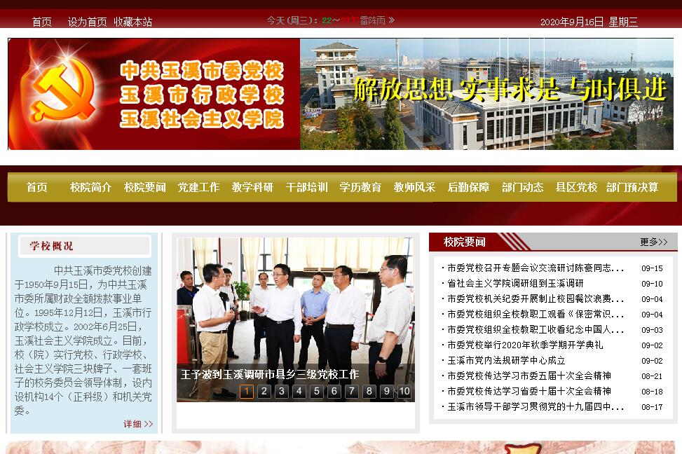 中共玉溪市委党校创建于1950年9月15日,为中共玉溪市委所属财政全额拨款事业单位。1995年12月12日,玉溪市行政学校成立。2002年6月25日,玉溪社会主义学院成立。目前,校(院)实行党校、行政学校、社会主义学院三块牌子、一套班子。校(院)位于玉溪市红塔区春和街道,与九龙池风景名胜区、飞井海水库水源保护地相邻,总占地面积155.83亩,校舍总建筑面积65584㎡,是一座基础设施配套齐全,功能布局均匀协调的现代化干部教育培训基地。校园分为教学区、生活区、运动区、名木古树区、文化畅想区五大功能区,建有现代化的综合楼、报告厅、学员楼、餐厅、专家公寓、文体馆、半地下架空停车库等设施,能同时容纳1000人学习、就餐、住宿。园内古树苍郁、山水相映、景色宜人,是云南省园林单位和玉溪市五星级园林单位。校内建有玉溪市反腐倡廉警示教育基地,是中央党校党建教学科研玉溪联系点和玉溪市领导干部法制教育培训基地、玉溪市军转干部培训基地、玉溪市工会活动基地、玉溪市市直单位职工活动中心、玉溪市社科普及宣传示范基地,被评为云南省文明单位、玉溪市食品流通监管系统试点单位、玉溪市餐饮服务食品安全A级单位和校园改扩建优质工程一等奖。