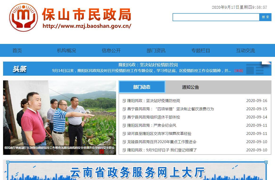 保山市民政局主要职责:(一)拟订民政事业发展政策、规划,制定部门规范性文件,并组织实施和监督检查。(二)拟订社会团体、基金会、社会服务机构等社会组织登记和监督管理办法并组织实施,依法对社会组织进行登记管理和执法监督,指导各县(市、区)对社会组织的登记管理和执法监督工作。负责市级新登记成立无业务主管单位的社会组织和市一级与行政机关脱钩后的行业协会商会的党建工作。(三)拟订社会救助政策、标准,统筹社会救助体系建设,负责城乡居民最低生活保障、特困人员救助供养、临时救助、生活无着流浪乞讨人员救助、脱贫攻坚兜底保障工作。(四)拟订行政区划、行政区域界限管理和地名管理政策、办法,负责报国务院、省政府、市政府审批的行政区划设立、撤销、命名、变更和政府驻地迁移审核工作。组织、指导县乡级行政区域界线的勘定、管理工作。负责地名管理工作,负责全市重要自然地理实体的命名、更名的审核工作。(五)组织拟订城乡基层群众自治建设和社区治理政策,指导城乡社区治理体系和治理能力建设,提出加强和改进城乡基层政权建设的建议,推动基层民主政治建设。(六)负责指导婚姻管理政策的执行,推进婚俗改革。(七)负责指导殡葬管理政策的执行,推进殡葬改革,规范殡葬服务行业管理。负责经营性公墓建设的审核上报。(八)组织拟订残疾人权益保护政策,统筹推进残疾人福利制度建设和康复辅助器具产业发展。(九)统筹推进、督促指导、监督管理养老服务工作,拟订老年人福利补贴制度和养老服务体系建设规划、政策、标准并组织实施。承担老年人福利和特殊困难老年人救助工作。(十)负责儿童福利、孤弃儿童保障、儿童收养、儿童救助保护政策、标准的执行,健全农村留守儿童关爱服务体系和困境儿童保障制度。(十一)组织拟订促进慈善事业发展政策,指导社会捐助工作,负责福利管理工作。(十二)负责加强社会工作专业人才管理机构和队伍建设,履行推进社会工作专业人才队伍建设的有关职能。组织拟订社会工作、志愿服务政策和标准,会同有关部门推进志愿者队伍建设。(十三)完成市委、市政府交办的其他任务。