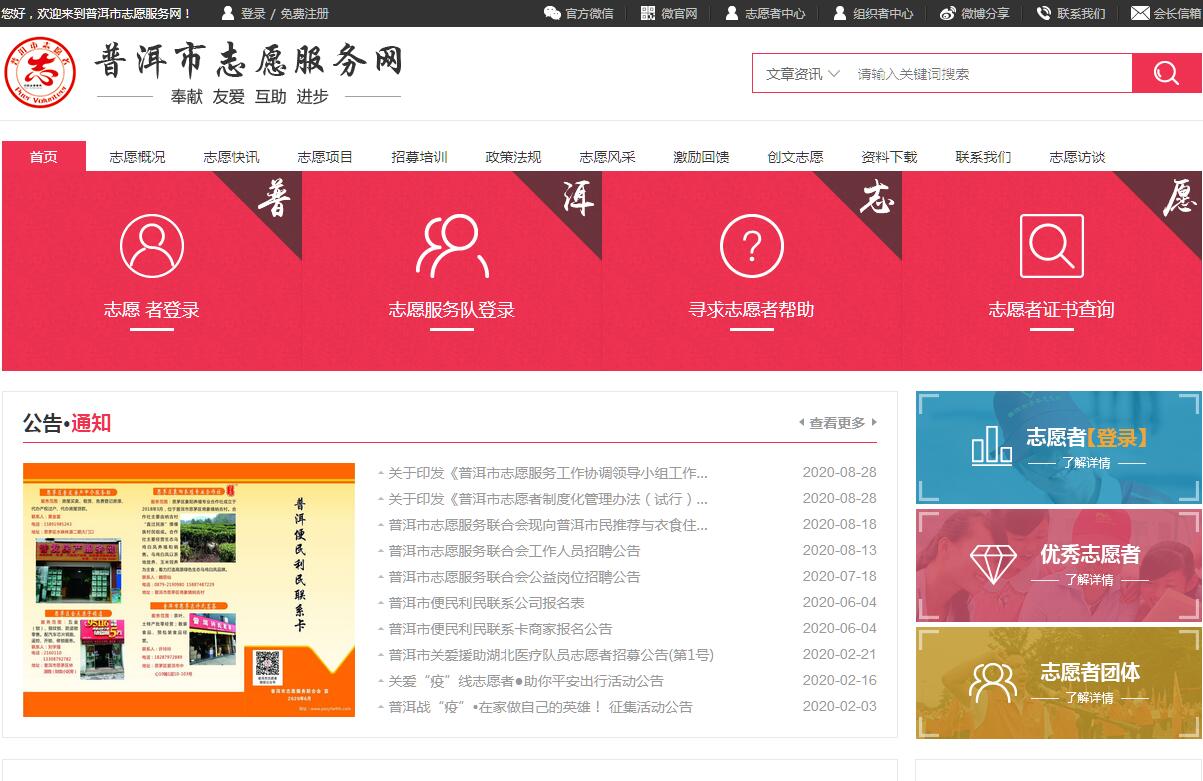 | 网站简介: 普洱市志愿服务网由普洱市志愿服务联合会主办。普洱市志愿服务联合会成立于2015年8月,是经普洱市民政局登记成立负责全市志愿者组织和管理工作的全市性、联合性、非营利性的社会团体。普洱市志愿服务联合会在普洱市文明委领导和普洱市文明办的指导下独立开展工作,在全社会广泛开展法律维权、医 疗卫生、环境保护、禁毒防艾、文明交通、家政服务、绿色发展、 关爱空巢老人、关爱留守儿童、关爱逬城务工人员、关爱残疾人、 志愿者家教、扶弱济困、应急救护知识宣传、救灾志愿服务等项目的志愿服务,欢迎社会各界爱心人士和爱心单位加入普洱市志愿者队伍,普洱市志愿者将竭诚服务于需要帮助的群众和服务于普洱科学发展、跨越发展、绿色发展。 |
