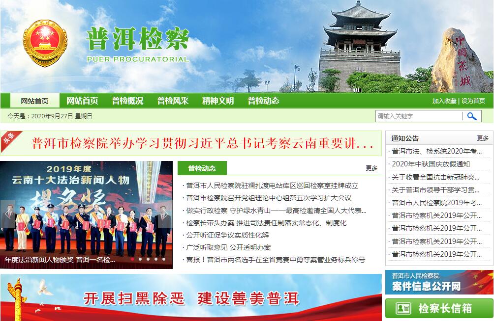 | 网站简介: 普洱市人民检察院前身是云南省人民检察院思茅分院,创建于1955年7月13日,2004年4月,思茅撤地设市,改称为思茅市人民检察院,2007年4 月,思茅市更名普洱市, 随之更名为普洱市人民检察院。普洱市人民检察院下辖思茅区、景东彝族自治县、镇沅彝族哈尼族拉祜族自治县、景谷傣族彝族自治县、墨江哈尼族自治县、宁洱哈尼族彝族自治县、江城哈尼族彝族自治县、澜沧拉祜族自治县、孟连傣族拉祜族佤族自治县、西盟佤族自治县十个县(区)人民检察院。 |
