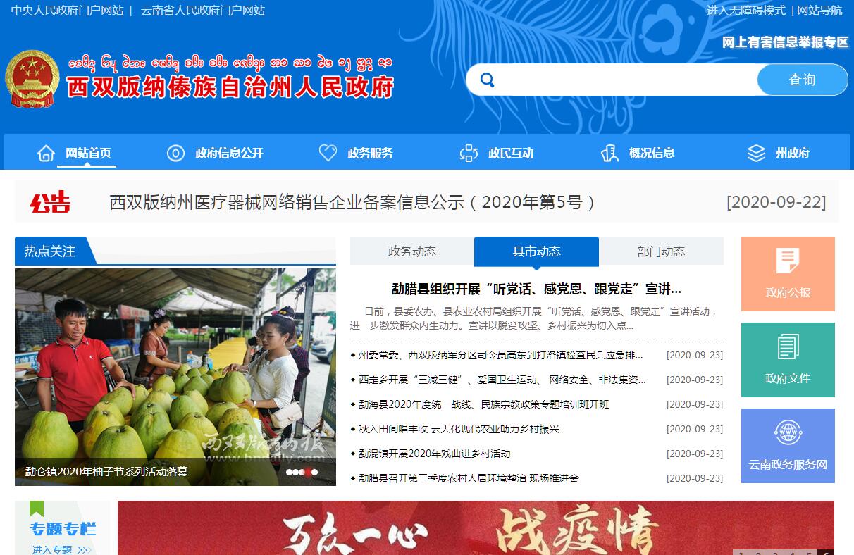 西双版纳傣族自治州,是云南省的8个自治州之一,首府景洪市。西双版纳位于北纬21°10′—22°40′,东经99°55′—101°50′,处于北回归线以南的热带北部边沿。国土面积有19124.5平方公里,东北、西北与普洱市接壤,东南与老挝相连,西南与缅甸接壤,国境线长966.3公里。州内最高点是勐海县勐宋乡的滑竹梁子,海拔2429米,最低点是澜沧江与南腊河的会合处,海拔477米。西双版纳地处热带北部边缘,属热带季风气候。西双版纳辖1个县级市、2个县,2017年,西双版纳常住总人口118.0万人,其中少数民族人口77.87万人,傣族是主体民族,世居着13种民族。2019年,全州生产总值5680948万元,比上年增长10.1%。其中,第一产业增加值1247212万元,增长5.5%;第二产业增加值1339575万元,增长22.1%;第三产业增加值3094161万元,增长6.7%。第一产业增加值占生产总值的比重为22.0%,第二产业增加值比重为23.6%,第三产业增加值比重为54.5%。人均生产总值47659元,比上年增长9.4%。非公有制经济增加值3127794万元,比上年增长11.1%,占生产总值的比重为55.1%,与上年持平。西双版纳有中国唯一的热带雨林自然保护区,是国家级生态示范区、国家级风景名胜区、联合国生物多样性保护圈成员,植物种类占全国的1/6,动物种类占全国的1/4,森林覆盖率80.8%,是中国第二大天然橡胶生产基地,大叶种茶的原生地、普洱茶的故乡,建有1个5A级景区,9个4A级景区,西双版纳以神奇的热带雨林自然景观和少数民族风情而闻名于世,是中国的热点旅游城市之一。