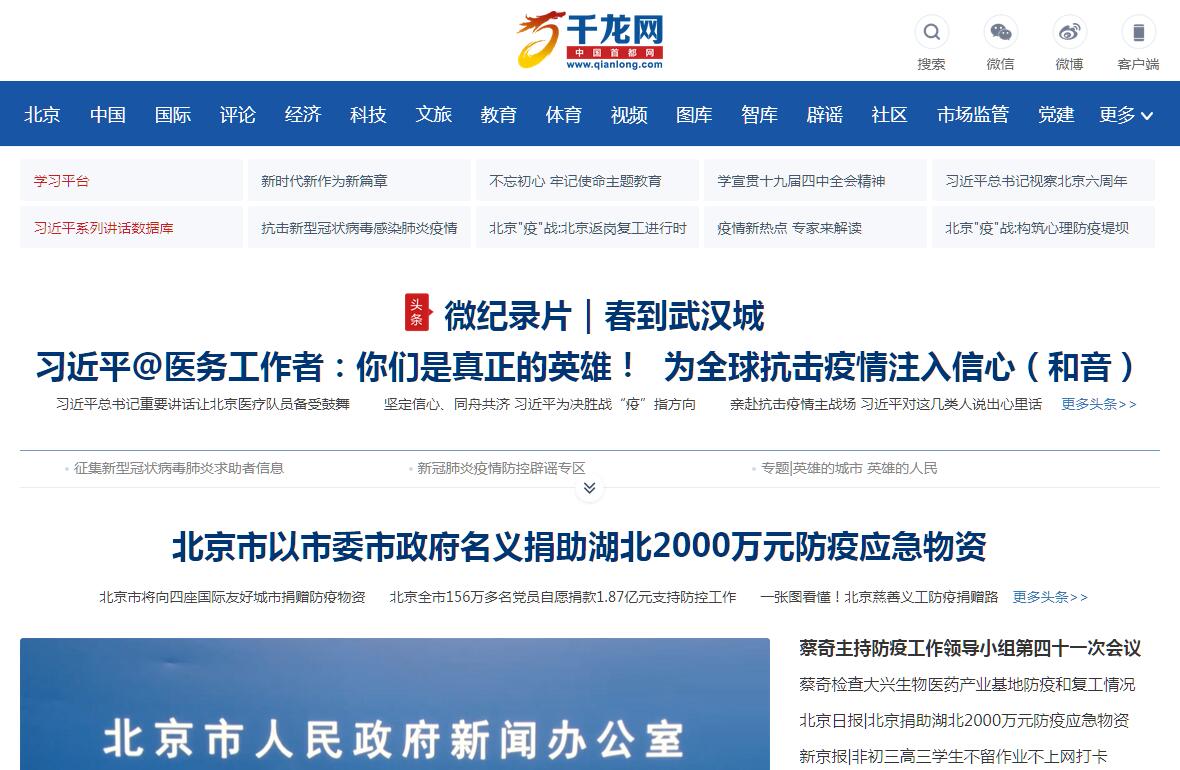 千龙网(http://www.qianlong.com),于2000年5月25日正式上线,别名“中国首都网”,移动门户名为“手机千龙网”,客户端名为“京城新闻”。千龙网由北京市委宣传部主管主办,是北京市属重点新闻网站、北京网络新闻信息的总门户、北京市委市政府网络舆论引导重要阵地、北京最具权威性和公信度的网络媒体,也是大型网上多媒体型态集聚平台、大型网上信息交互平台、大型综合类网络服务平台。千龙网是建设中的北京市新型主流媒体。协办全党全国第一家理论宣讲报告视频网站“宣讲家网”,实现新闻网站与理论视频网站融合发展。建设运维“北京地区网站联合辟谣平台”(http://py.qianlong.com),实现重点新闻网站、主要商业网站、传统媒体融合发展。受权独家建设运维2014年APEC会议官方网站。千龙网网站推广语为:“千龙网·中国首都网”。网友称誉千龙网的口碑语为:“爱上千龙”。千龙网坚守“主流、实用、时尚、现代”品牌形象,奉行“正确导向、开拓创新、唯先是夺”网站精神,大力发展以创新为核心的工作基因和价值基因。千龙网荣获“最具价值地方门户”、“最具商业价值的中国网站100强”、“中国网络媒体优秀单位”、“中国互联网诚信示范企业”、“优秀网络文化传播奖”、“互联网舆情工作先进集体”、“互联网行业爱心公益贡献奖”、北京网络视听节目成果与创新成就“网络视听产业突出贡献平台”、“北京最美慈善义工十大榜样团体”、“北京属地网站党建工作先进集体”等称号。多篇新闻信息作品获评中国新闻奖、中国人大新闻奖、北京新闻奖。
