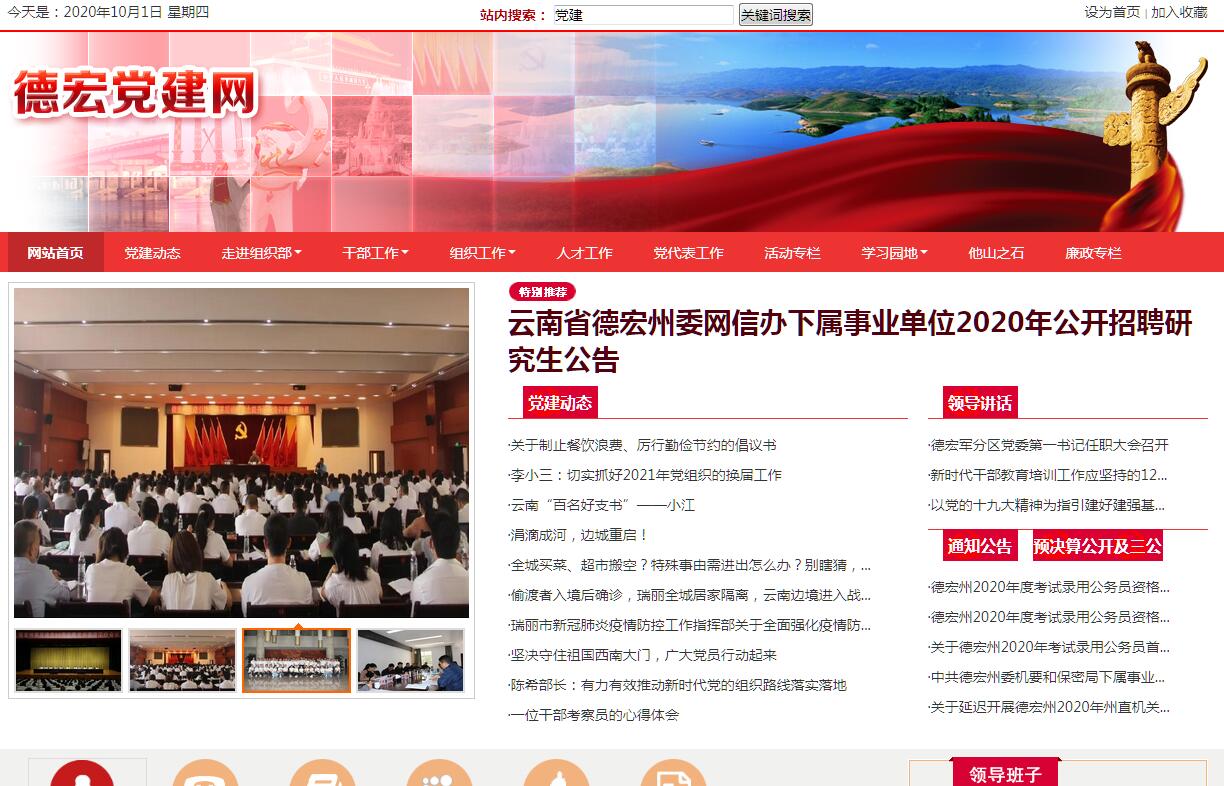 德宏党建网是在中共德宏州委组织主办的全州地方性党建网站。中共德宏州委组织部主要工作职责:一、研究和指导全州党组织、特别是党的基层组织的建设,探索各类新的经济组织中党组织的设置和活动方式;研究规划党员教育和党员管理工作,制定全州发展党员的计划和措施;组织新时期党的建设的理论研究。二、研究提出县市、州委和州级国家机关部委办局及其他列入州委管理的领导班子调整、配备的意见和建议;加强领导班子的思想作风建设;负责州委管理的干部的考察和任免、工资、待遇、退(离)休审批手续的办理;协助省委组织部和按州委安排考察并承办省管干部的任免、工资、退(离)休报批手续。三、研究制定全州干部队伍建设的具体办法和意见,组织落实培养和选拔中、青年干部工作。四、宏观指导全州党的组织制度和干部人事制度的改革。制定或参与制定全州组织、干部、人事工作的有关政策和制度。五、负责全州组织工作和干部工作的调查研究、检查督促,及时向州委反映重要情况,提出建议。六、研究和指导全州干部教育工作,拟定全州干部教育培训计划,组织州管干部和组织系统以及有关党政干部进行培训;指导、协调、检查各县市及州直各部委办局的干部教育工作;协助各县市州直各部门搞好干部培训基地、乡镇党校及其师资队伍建设工作。抓好农村远程教育和党内宣传工作。七、负责全州知识分子工作的指导、督查、综合、协调;代州委管理一批优秀专家和拔尖人才,并组织开展有关活动。八、指导全州退(离)休干部工作,管理州委老干部局。九、研究指导全州干部和选拔任用干部工作的监督工作,干部审查、历史遗留问题的审理工作,管理党员、州管干部的申诉和来信来访工作。十、完成省委组织部和州委交办的其他任务。