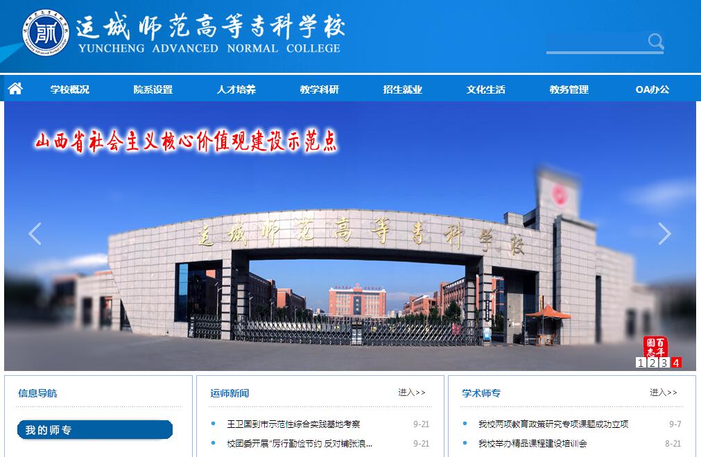 运城师范高等专科学校是经山西省人民政府和国家教育部正式批准备案的公办全日制高等师范院校。学校位于运城市舜帝陵景区的大学城,与运城学院和运城护理职业学院毗邻,占地450余亩,是一所高标准、现代化的师范专科学校。作为其前身的运城师范学校和稷山师范学校,都曾是享誉河东、名扬三晋的老牌名校。一个世纪以来,为国家培养了首任驻美大使柴泽民,原国务院副秘书长郑思远,全国政协常委、中国作协副主席、山西省副省长张平,原成都军区政委上将张志坚等一批著名党政军干部和数以万计的优秀中小学教师。改革开放后,我校以质量求生存、以管理谋发展、以科研为先导、以就业为导向、以培养具有创新精神和实践能力的专科层次小学教师为根本,夯实高师基础,凸显师范特色,深化以教学为中心的各项改革,不断提升学校办学水平和综合实力,为山西向东向西经济发展及晋、陕、豫黄河金三角社会经济和地方教育事业发展与全面进步提供了强有力的人才支撑和智力支持,赢得了社会的广泛认可,先后荣获“全国素质教育百面旗”、“全国艺术教育先进单位”、“全国体育工作先进单位”、“全国五四红旗团委”、“山西省优秀师范学校”、“山西省文明学校”、“山西省中小学教师培养工作先进单位”等多项殊荣。学校环境优美、设施先进。有教学楼、实验楼、艺术楼、图书馆、演播大厅、体育馆、办公楼、学生公寓楼、餐厅等15栋高标准建筑。配备有微机室、校园广播电视台、语音室、电子图书阅览室、心理咨询室、理化实验室、塑胶操场等现代化教学设施,所有教室全部安装有多媒体教学设备。学校师资力量雄厚。共有专兼职教师429人,其中博士研究生2人,硕士研究生125人,外籍教师4人,特级教师3人,全国模范教师2人,省级学科带头人7人,省级骨干教师8人,副教授107人,讲师203人,是国家级课题研究实验校。学校始终坚持“以人为本”的办学思想,积极探索融合传授知识、培养能力、提高素质、发展个性为一体的新型人才培养方案,突出师范特色,注重学生基本功培养。要求每个学生都要通过国家普通话测试、简笔画过关测试、规范字书写等级考核。积极组织学生参加小学教师资格证、英语四六级考试、计算机等级考试和专升本考试,每年都有一大批学生升入高一级院校继续深造。运城高等师范专科学校是你塑造完美人格、提高从业能力、实现人生价值的理想选择。