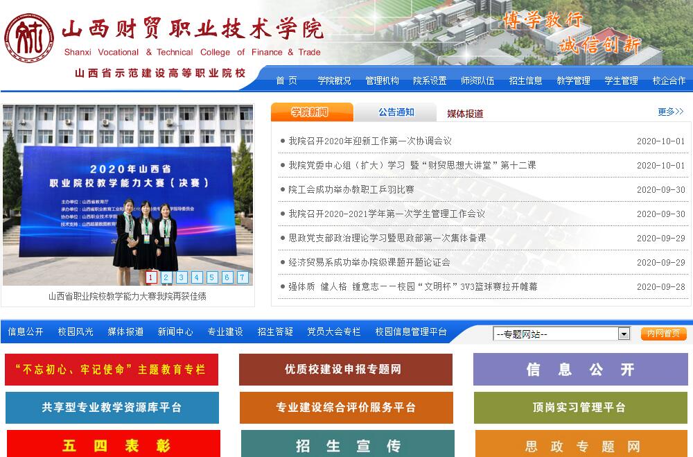 山西财贸职业技术学院是经教育部、山西省人民政府批准建立的、隶属于山西省教育厅的全日制专科层次的公办普通高等学校。始建于1978年8月,前身为山西省财贸学校。1993年10月被评为省部级重点中专,1994年11月被评为国内贸易部系统重点中专,2000年5月被评为国家级重点中专。2002年4月升格为山西财贸职业技术学院,是“山西省示范性高等职业院校”。学院位于太原市民航南路26号,占地面积10万余平方米,校舍面积9万余平方米,拥有教学楼、学生公寓、餐厅、礼堂、标准运动场,设有11个电子阅览室,建有58个先进的、并与专业配套的现代化实验实训室,教学活动全部采用多媒体教学手段。图书馆现有藏书26.2万余册,电子图书23.6万余册,电子期刊6.7万册,学位论文25万册,音视频200小时。配备电脑1920台,多媒体设备142套。校园网络构架合理规范,办公、教学、实验实训区域全网络覆盖。在校生规模5330余人。现有在编教师250人,其中高教授3人、副教授70人、硕士研究生以上160人。设有会计系、经济贸易系、物联网技术系、文化旅游系、工程艺术设计系、公共课基础教学部、思想政治理论教学部和校企合作培训部等8个教学单元,共17个专业。其中有:会计、制冷与空调技术2个中央财政支持重点建设专业,市场营销1个省级教学改革试点专业,会计、连锁经营管理2个省级特色专业,会计、市场营销、电子商务、物流管理4个山西省高职院校品牌专业,会计、物流管理、广告设计与制作、旅游管理、制冷与空调技术5个省级示范校重点建设专业,投资与理财、计算机网络技术2个省级重点建设专业,环境与艺术设计1个职业教育高水平重点专业;1个中央财政支持的物流实训基地,1个省财政支持的制冷实训基地,2个省级示范实训基地,2个省级重点建设实训基地,1个省级高水平实训基地。拥有“五一”劳动奖章获得者、山西省“双师型”优秀教师等一批优秀教师。历届学生在全国、全省大学生文化与职业技能大赛中名列前茅,成绩斐然。学院不断探索与创新教育教学方法和育人模式,教育成果斐然,赢得了良好的社会声誉,先后荣获“省级文明单位”、“山西省示范性高等职业院校”、“山西省德育示范学校”、“山西省模范单位”、“山西省民主管理模范学校”、“山西省大学生思想政治教育先进集体”、“山西省职业教育先进单位”、“山西省创建平安校园先进单位”、“全省高校‘三项治理’工作先进集体”、“高校档案工作先进单位”、“山西省伙食工作先进单位”、“山西省计算机应用能力考核先进单位”、“太原市普通话测试先进集体”等众多荣誉称号。近年来,学院荣获国家级、省级现代学徒制试点单位;山西省示范性高等职业院校;山西省职业教育先进单位;山西省优质校培育建设单位。学院秉承“博学、敦行、诚信、创新”的校训,全方位倡导和培育“和谐求真,开拓进取”的校风、“敬业爱生,尚德育人”的教风和“励志笃学,博知精技”的学风,力求营造“和谐、诚信、活泼”的校园文化氛围和“创先争优”的工作风气,努力向特色鲜明、省内一流的高职院校迈进。