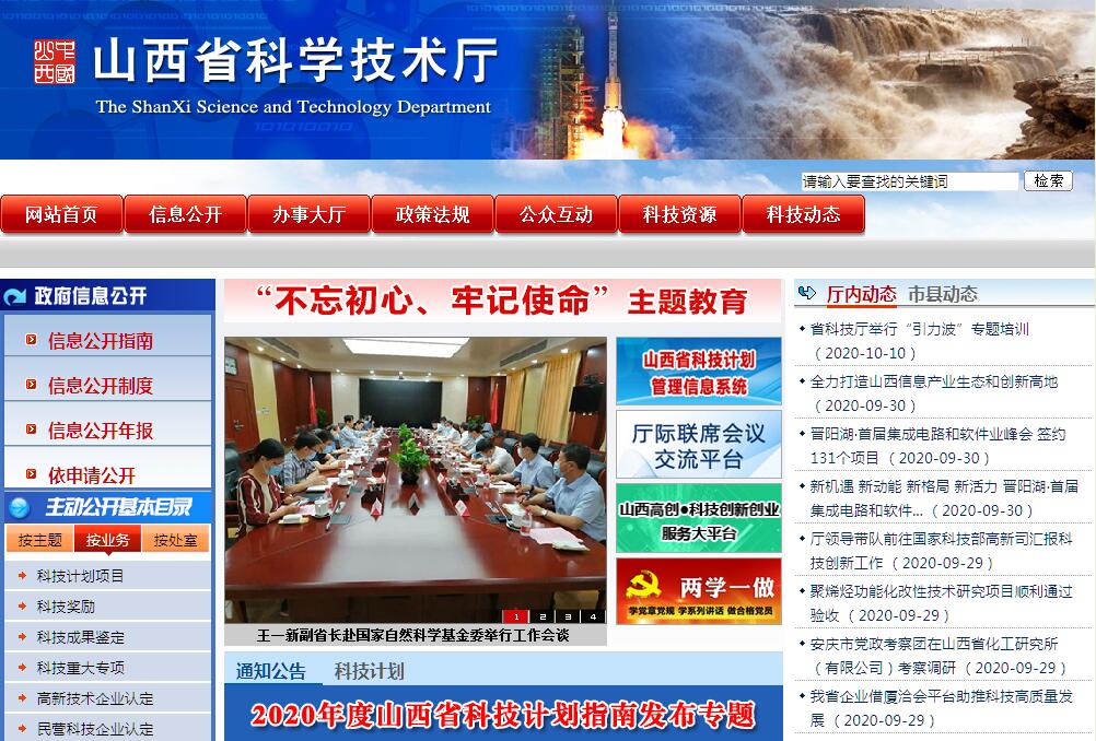 山西省科学技术厅主要职责:(一)拟订全省创新驱动发展战略方针以及科技发展、引进国外智力的规划和政策并组织实施。(二)统筹推进全省创新体系建设和科技体制改革,会同有关部门健全技术创新激励机制。优化科研体系建设,指导科研机构改革发展,推动企业科技创新能力建设,承担推进科技军民融合发展相关工作,推进全省重大(重点)科技决策咨询制度建设。(三)牵头建立全省统一的科技管理平台和科研项目资金协调、评估、监管机制。会同有关部门提出优化配置科技资源的政策措施建议,推动多元化科技投入体系建设,协调管理省级财政科技计划(专项、基金等)并监督实施。(四)拟订省基础研究规划、政策和标准并组织实施,组织协调省重大(重点)基础研究和应用基础研究。拟订重大(重点)科技创新基地建设规划并监督实施,参与编制重大(重点)科技基础设施建设规划和监督实施,牵头组织省级以上(含省级)重点实验室等平台建设,推动科研条件保障建设和科技资源开放共享。(五)编制重大(重点)科技项目规划并监督实施,统筹关键共性技术、前沿引领技术、现代工程技术、颠覆性技术研发和创新,牵头组织重大(重点)技术攻关和成果应用示范。组织协调我省国际科学计划和科学工程。(六)组织拟订高新技术发展及产业化、科技促进农业农村和社会发展的规划、政策和措施。组织开展重点领域技术发展需求分析,提出重大(重点)任务并监督实施。认定和管理高新技术企业。(七)牵头全省技术转移体系建设,拟订科技成果转移转化和促进产学研结合的相关政策措施并监督实施。指导科技服务业、技术市场和科技中介组织发展。(八)统筹区域科技创新体系建设,指导区域创新发展、科技资源合理布局和协同创新能力建设,推动高新技术产业开发区等科技园区建设。(九)负责科技监督评价体系建设和相关科技评估管理,指导科技评价机制改革,统筹科研诚信建设。组织实施创新调查和科技报告制度,指导科技保密工作。(十)拟订科技对外交往与创新能力开放合作的规划、政策和措施,组织开展国际科技合作与科技人才交流。指导我省相关部门和各市对外科技合作与科技人才交流工作。(十一)负责引进国外智力工作。拟订省重点引进外国专家总体规划、计划并组织实施,建立外国高端专家、团队吸引集聚机制和重点外国专家联系服务机制。拟订出国(境)培训总体规划、政策和年度计划并监督实施。(十二)会同有关部门拟订省科技人才队伍建设规划和政策,建立健全科技人才评价和激励机制,组织实施科技人才计划,推动高端科技创新人才队伍建设。拟订科学普及和科学传播规划、政策。(十三)负责省科学技术奖的评审组织工作。(十四)负责组织、协调、管理我省自然科学基金相关工作。(十五)完成省委、省人民政府交办的其他任务。