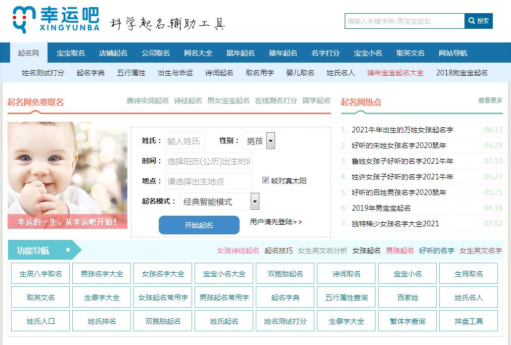 | 网站简介: 幸运吧起名网是基于汉语语言文学、诗词国学、统计学(千万级大数据分析)、心理学、人工智能为一体的宝宝起名系统,起名网主要有男孩起名、女孩起名、诗词起名、传统起名、公司起名等在线起名等功能,是起名必备工具! |
