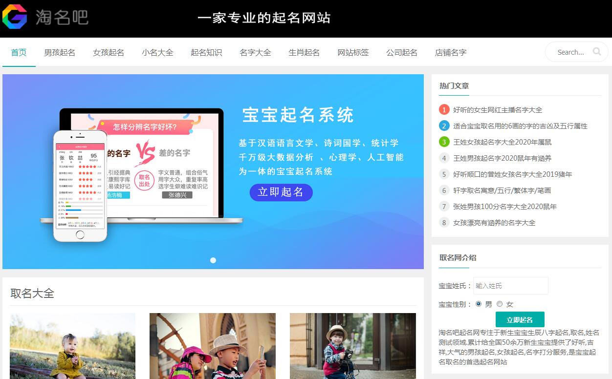 | 网站简介: 淘名吧网是一个智能男孩女孩免费取名系统,是最专业的在线起名网站。它通过非常简单的步骤,根据用户的起名意愿,可以迅速完成生辰八字起名,宝宝取名大全。 |