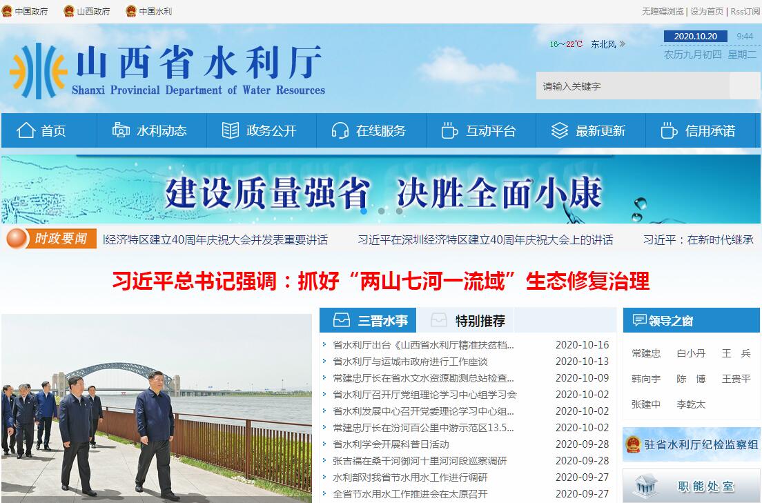 山西省水利厅主要职责:(一)负责保障全省水资源的合理开发利用。拟订全省水利战略规划和政策,起草有关地方性法规、规章草案,组织编制全省水资源战略规划、省确定的重要河湖流域综合规划、防洪规划等重大水利规划。(二)负责生活、生产经营和生态环境用水的统筹和保障。组织实施最严格水资源管理制度,实施全省水资源的统一监督管理,拟订全省和跨市水中长期供求规划、水量分配方案并监督实施。负责全省重要流域、区域以及重大调水工程的水资源调度。组织实施取水许可、水资源论证和防洪论证制度,指导开展水资源有偿使用工作。指导全省水利行业供水和乡镇供水工作。(三)按规定制定全省水利工程建设有关制度并组织实施,负责提出全省水利固定资产投资规模、方向,安排意见,并组织指导实施。按省政府规定权限审核、审批规划内和年度计划规模内固定资产投资项目。提出全省水利资金安排建议并负责项目实施的监督管理。(四)指导全省水资源保护工作。组织编制并实施全省水资源保护规划。指导全省饮用水水源保护有关工作,指导全省地下水开发利用、地下水资源管理保护。组织指导全省地下水超采区综合治理。(五)负责全省节约用水工作。拟订节约用水政策,组织编制全省节约用水规划并监督实施,组织制定节约用水相关标准。组织实施用水总量控制等管理制度,指导和推动节水型社会建设工作。(六)负责全省水文工作。负责全省水文水资源监测、水文站网规划、建设和管理。对省内河湖库和地下水实施监测,发布全省水文水资源信息、情报预报和全省水资源公报。按规定组织开展水能资源调查评价和水资源承载能力监测预警工作。(七)指导水利设施、水域及其岸线的管理、保护与综合利用。负责组织指导河湖长制工作。组织指导水利基础设施网络建设。指导全省重要河湖及河口、河岸滩涂的治理、开发和保护。指导全省河湖水生态保护与修复、河湖生态流量水量管理以及河湖水系连通工作。(八)指导监督全省水利工程建设与运行管理,组织实施具有控制性的或跨市及跨流域的重要水利工程建设与运行管理。组织实施大水网骨干工程建设及运行管理,指导县域小水网建设及运行管理。组织水利工程验收有关工作。指导水利建设市场的监督管理和水利建设市场信用体系建设。(九)负责水土保持工作。拟订全省水土保持规划及监督实施,组织实施全省水土流失的综合防治、监测预报并定期公告。负责建设项目水土保持监督管理工作,指导全省重点水土保持建设项目的实施。(十)指导农村水利水电工作。组织开展全省大中型灌排工程建设与改造。指导全省农村饮水安全工程建设管理及节水灌溉工作。协调牧区水利工作。指导全省农村水利改革创新和社会化服务体系建设。指导全省农村水能资源开发、小水电改造和水电农村电气化工作。(十一)指导全省水利工程移民管理工作。拟订全省水利水电工程移民有关政策并监督实施,组织实施水利水电工程移民安置验收、监督评估等制度。指导监督水库移民后期扶持政策的实施工作。(十二)负责全省重大涉水违法事件的查处,协调跨市水事纠纷,指导全省水政监察和水行政执法。监督水利重大政策、决策部署和重点工作的贯彻落实。组织实施全省水利工程质量和安全监督。依法负责全省水利行业安全生产工作,组织指导全省水库、水电站大坝、农村水电站的安全监管。(十三)开展水利科技和外事工作。组织开展全省水利行业质量技术监督工作。拟订全省水利行业的技术标准、规程规范并监督实施。指导水利信息化建设管理,组织水利信息化建设项目的审查并监督实施,办理有关水利涉外事务。(十四)负责落实综合防灾减灾规划相关要求,组织编制全省洪水干旱灾害防治规划和防护标准并指导实施。承担水情旱情监测预警工作。组织编制全省重要河湖和重要水工程的防御洪水抗御旱灾调度及应急水量调度方案,按程序报批并组织实施。承担防御洪水应急抢险的技术支撑工作。(十五)完成省委、省人民政府交办的其他任务。