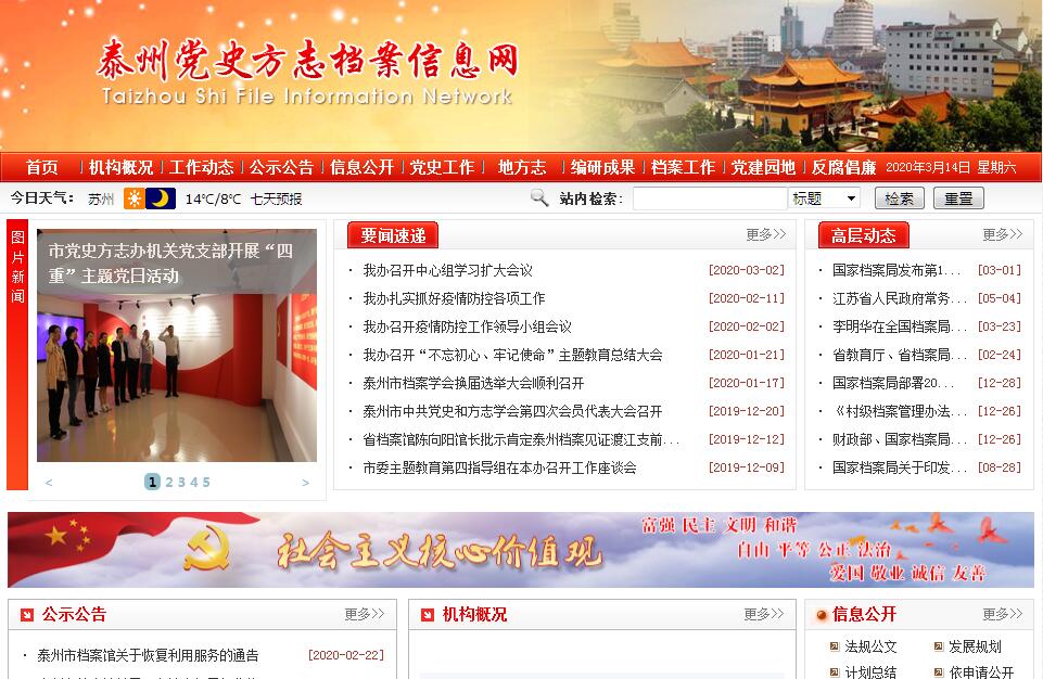 泰州市史志档案信息网由泰州市史志档案办公室主办。1996年11月20日,市委、市政府(泰委[1996]38号文件)研究决定,成立泰州市史志档案办公室(挂泰州市档案局(馆)牌子)。1997年4月11日,市编委(泰编[1997]89号)文件批复,市史志档案办公室主管全市党史、地方志、档案、年鉴工作并具体负责海陵区的党史、档案工作;内设10个处,具体为人秘处、档案管理处、征集处、档案业务指导一处、档案业务指导二处、科教处、党史编研一处、党史编研二处、地方志编纂指导处和年鉴编辑处。1998年1月15日,市委组织部(泰组发[1998]6号)文件,确定泰州市史志档案办公室为参照国家公务员制度管理单位。1998年12月31日,市编委(泰编[1998]117号)文件批复,同意建立泰州市档案技术中心,主要从事档案技术的研究与推广应用工作,为全民事业单位,隶属于市史志档案办公室领导。2006年6月15日,市编办(泰编办[2006]33号)文件批复,同意将党史编研一处更名为党史宣传联络处,党史编研二处更名为党史编研处。2010年8月23日,中共泰州市委(泰办发〔2010〕70号)文件批复,同意将泰州市史志档案办公室更名为泰州市党史方志档案办公室,主管全市党史、地方志、档案工作,为市委直属事业单位,挂市档案局、市档案馆牌子。设11个内设机构,具体为综合处、党史宣传联络处、党史编研处、地方志编纂指导处、年鉴编辑处、档案业务指导处、档案法规教育处、信息技术处、征集编研处、保管利用处、现行文件利用处(行政许可服务处)。泰州市党史方志档案办公室不再承担海陵区的党史、档案工作,实行属地管理。