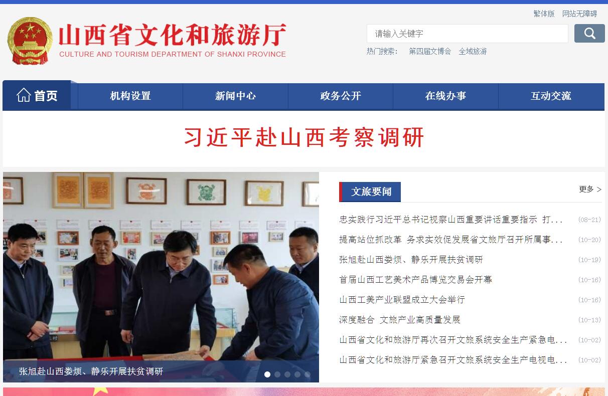 山西省文化和旅游厅主要职责:第一条贯彻落实党的文化工作方针政策,组织实施关于文化和旅游的法律法规,贯彻落实省委、省人民政府关于文化和旅游工作的决策部署,研究拟订文化和旅游政策措施,起草文化和旅游地方性法规、规章草案。第二条统筹规划全省文化事业、文化产业和旅游业发展,制定发展规划和年度计划并组织实施。推进文化和旅游与相关领域的融合发展,推进文化和旅游体制机制改革。指导协调全省基层文化和旅游工作。第三条管理全省性重大文化和旅游活动。指导省级重点文化设施建设和基层文化设施建设。组织全省旅游整体形象推广,促进文化产业和旅游产业对外合作和国际、国内市场推广。制定旅游市场开发战略并组织实施。提高旅游资源开发利用效能,指导、推进全域旅游,助推城镇化建设和新农村建设。第四条指导、管理全省文艺事业,指导协调艺术创作生产,扶持体现社会主义核心价值观、具有导向性代表性示范性的文艺作品,推动各门类艺术、各艺术品种发展。第五条负责公共文化事业发展,推进公共文化服务体系和旅游公共服务体系建设,深入实施文化惠民工程,统筹推进基本公共文化服务标准化、均等化。指导建立健全全省智慧旅游、旅游集散、旅游公共信息和咨询服务平台体系,推动旅游服务便利化。第六条指导、推进文化和旅游科技创新发展,推动文化和旅游科技研究成果的推广应用。推进文化和旅游行业信息化、标准化建设。管理全省艺术教育、文化科技研究工作,指导艺术教育体制改革。拟订全省艺术教育、文化科技发展规划并组织实施。组织实施旅游区、旅游设施、旅游服务、旅游产品等方面的国家标准和行业标准,会同有关部门拟订全省旅游业的地方性标准并组织实施。第七条贯彻落实国家有关非物质文化遗产保护政策,负责全省非物质文化遗产保护,拟订非物质文化遗产保护规划,组织实施非物质文化遗产的保护、传承、普及、弘扬和振兴。第八条统筹规划文化产业和旅游产业,组织实施文化和旅游资源普查、挖掘、保护和利用工作,促进文化产业和旅游产业发展。指导重点旅游区域、旅游目的地和旅游线路的规划开发,引导休闲度假。负责对旅游景区、景点质量等级评定和公告。负责假日旅游、特种旅游和红色旅游工作。对从事编制旅游规划的单位进行资质认证管理。承担省人民政府旅游改革发展领导小组办公室的日常工作。指导培育文化和旅游新产品、新业态,组织构建旅游产业体系。对工艺美术进行行业管理。第九条拟订全省文化和旅游市场发展规划,指导文化和旅游市场发展,对文化和旅游市场经营进行行业监管,推进文化和旅游行业信用体系建设,依法规范文化和旅游市场。强化对全省旅游市场秩序和服务质量的综合监管,建立健全旅游综合协调、旅游案件联合查办、旅游投诉统一受理等综合监管机制,引导全社会文明旅游。监测旅游经济运行,负责旅游统计及行业信息发布。综合协调、监督管理旅游业安全,指导应急救援工作。管理公民出国(境)旅游、边境旅游,负责出境组团社的审核。第十条负责文化和旅游行政审批工作。负责对文化类社会组织进行登记前审查、核准和日常管理、监督。指导文化和旅游行业组织的业务工作。第十一条指导全省文化和旅游市场综合执法,组织查处全省性、跨区域文化、旅游等市场的违法行为,督查督办大案要案,维护市场秩序。第十二条贯彻落实国家文化和旅游对外及对港澳台交流政策,指导、管理文化和旅游对外及对港澳台交流、合作和宣传、推广工作,组织实施重大文化和旅游对外及对港澳台交流活动,推动山西文化走出去。第十三条制定并组织实施全省文化和旅游行业人才教育培训规划,组织实施从业人员职业资格制度和等级制度。第十四条牵头办理与文物领域紧密相关的重要事项,与省文物局以联席会议制度进行协调协商。第十五条承担省委、省人民政府交办的其他任务。