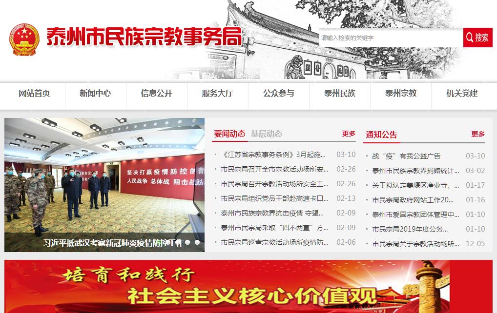 泰州市民族宗教事务局主要职能:(一)贯彻执行国家、省关于民族宗教工作的方针政策和法律法规;负责民族宗教政策法规的宣传教育;负责督促检查民族宗教政策和法律法规的执行情况;协调推动有关部门履行民族宗教相关工作职责。(二)依法保护本市少数民族公民的合法权益;组织和承办民族团结进步表彰等活动;协助有关部门做好培养选拔少数民族干部工作;负责联系各界少数民族代表人士。(三)调查本市少数民族生产、生活情况;会同有关部门管理少数民族专项资金和做好少数民族扶贫工作。(四)协助有关部门加强对生产和销售清真食品的扶持和管理,落实少数民族特需用品的生产和供应工作;参与边疆民族地区的经济技术合作、对口支援工作。(五)依法履行宗教事务管理职责;依法保护公民的宗教信仰自由和正常的宗教活动;依法保护宗教教职人员开展正常的教务活动;依法审批宗教活动场所。(六)指导宗教团体依法依章开展活动;保护宗教团体和宗教活动场所的合法权益;支持宗教团体加强自身建设;推动宗教团体在宗教界开展爱国主义、社会主义、拥护祖国统一和民族团结的自我教育;协助宗教团体培养、教育宗教教职人员;办理宗教团体需由政府协助或协调的事务。(七)指导全市民族宗教事务部门依法履行管理职责,处理民族宗教事务的重大事项;引导、促进宗教在法律法规和政策允许的范围内活动;防范利用宗教进行非法、违法活动;配合有关部门抵御境外利用宗教进行的渗透活动,揭露、打击各类邪教活动。(八)掌握全市民族宗教动态;协调处理涉及民族政策和民族关系等方面的涉外事务;负责宗教方面的外事归口管理工作,组织指导全市民族宗教事务部门和宗教界开展对外以及对港澳台地区的友好交往活动;配合有关部门及时妥善处理涉及民族宗教方面的突发事件。(九)承办市政府交办的其他事项。