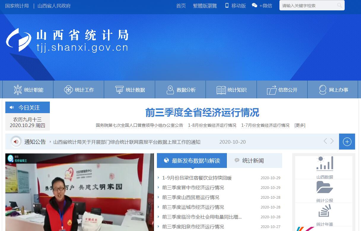 山西省统计局主要职责:(一)承担组织领导和协调全省统计工作,确保统计数据真实、准确、及时。制定全省性的统计政策、规划、基本统计制度和统计标准,指导全省统计工作。(二)健全完善全省国民经济核算体系,拟定并组织实施全省国民经济核算制度和全省投入产出调查方案,核算全省及各市国内生产总值,汇编提供国民经济核算资料,监督管理各地区国民经济核算工作。(三)根据上级部门重大国情国力普查计划、方案,组织实施全省人口、经济、农业等重大国情国力普查,汇总、整理和提供有关全省国情国力方面的统计数据。(四)组织实施农林牧渔业、工业、建筑业、批发和零售业、住宿和餐饮业、房地产业、租赁和商务服务业、居民服务和其他服务业、文化体育和娱乐业以及装卸搬运和其他运输服务业、仓储业、计算机服务业、软件业、科技交流和推广服务业、社会福利业等统计调查,收集、汇总、整理和提供有关调查的统计数据,综合整理和提供地质勘查、旅游、交通运输、邮政、教育、卫生、社会保障、公用事业等全省性基本统计数据。(五)组织实施管理能源、投资、消费、价格、收入、科技、人口、劳动力、社会发展基本情况、环境基本状况等统计调查,收集、汇总、整理和提供有关调查的统计数据,综合整理和提供资源、房屋、对外贸易、对外经济等全省性基本统计数据。(六)组织各地区、各部门的经济、社会、科技和资源环境统计调查,统一核定、管理、公布全省性基本统计资料,定期发布全省国民经济和社会发展情况的统计信息,组织建立部门间统计信息共享制度和发布制度。(七)对国民经济、社会发展、科技进步和资源环境等情况进行统计分析、统计预测和统计监督,向省委、省人民政府及有关部门提供统计信息和咨询建议。(八)审批部门统计标准,依法审批或者备案各部门统计调查项目、地方统计调查项目,指导专业统计基础工作、统计基层业务基础建设,组织建立服务业统计信息管理制度,建立健全统计数据质量审核、监控和评估制度,开展对重要统计数据的审核、监控和评估,依法监督管理涉外调查活动。(九)协助管理设区的市统计局局长、副局长,管理省设在各市、县的调查监测中心和调查队,指导全省统计专业技术队伍建设,会同有关部门组织管理全省统计专业资格考试、职务评聘和从业资格认定工作,监督管理中央及省财政提供给市、县以及乡镇统计部门的统计经费和专项基本建设投资以及固定资产投资。(十)建立并管理全省统计信息自动化系统和统计数据库系统,组织制定各地区、各部门统计数据库和网络的基本标准和运行规则,指导地方统计信息化系统建设。(十一)开展统计工作和统计科学的国内及国际交流与合作,承担国家统计局受国际组织委托的有关统计交流合作项目。(十二)承办省人民政府交办的其他事项。