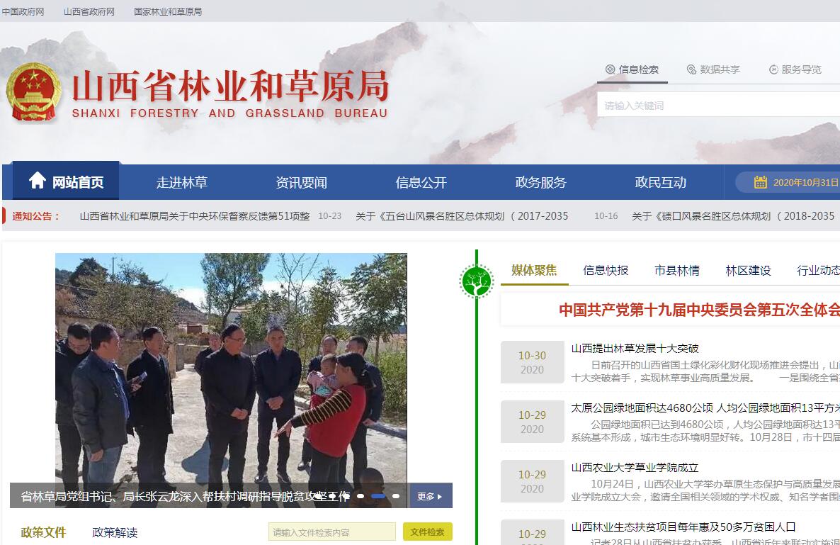 山西省林业和草原局主要职责:(一)负责全省林业和草原及其生态保护修复的监督管理。 拟订全省林业和草原及其生态保护修复的政策、规划、标准并组织实施,起草相关地方性法规、规章草案。组织开展全省森林、草原、湿地、荒漠和陆生野生动植物资源动态监测与评价。承担省绿化委员会的日常工作。(二)组织全省林业和草原生态保护修复和造林绿化工作。组织实施林业和草原重点生态保护修复工程,开展退耕(牧)还林还草,指导公益林和商品林的培育,指导、监督全民义务植树、城乡绿化工作。组织、指导林业和草原有害生物防治、检疫工作。承担林业和草原应对气候变化的相关工作。(三)负责全省森林、草原、湿地资源的监督管理。组织编制并监督执行全省森林采伐限额,指导执行林木凭证采伐、运输,指导森林经营、利用工作。负责林地、林权管理和天然林保护工作,拟订林地保护利用规划并组织实施,组织、指导公益林划定和管理工作,管理省直林区的国有林管理机构及森林资源。负责草原禁牧、草畜平衡和草原生态修复治理工作,监督管理草原的开发利用。负责湿地生态保护修复工作,贯彻国家湿地保护标准,拟订全省湿地保护规划并组织实施,监督管理湿地的开发利用。(四)负责监督管理全省荒漠化防治工作。组织开展荒漠调查,组织拟订全省防沙治沙、石漠化防治及沙化土地封禁保护区建设规划,按照国家荒漠化防治标准拟订配套政策措施并监督实施,监督管理沙化土地的开发利用,组织、指导沙尘暴灾害预测预报和应急处置。(五)负责全省陆生野生动植物资源监督管理。组织开展陆生野生动植物资源调查,拟订及调整省级重点保护的陆生野生动物、植物名录,组织、指导陆生野生动植物的救护繁育、栖息地恢复发展、疫源疫病监测,监督管理陆生野生动植物猎捕或采集、人工繁育或培植、拯救保护、经营利用,按分工监督管理野生动植物进出口。(六)负责监督管理全省国家公园、自然保护区、森林公园、湿地公园、风景名胜区、自然遗产、地质公园、沙漠公园等各类自然保护地。在国家自然保护地规划和相关国家标准指导下,负责全省各类自然保护地的设立、规划、建设和特许经营等工作,负责各类自然保护地的自然资源资产管理和国土空间用途管制。提出新建、调整、撤销各类省级自然保护地的审核建议并按程序报批,承担世界自然遗产和世界自然与文化双重遗产项目的相关工作。负责生物多样性保护相关工作。(七)负责推进林业和草原改革相关工作。拟订集体林权制度、省直国有林区、国有林场、草原等重大改革意见并监督实施。拟订农村林业发展、维护林业经营者合法权益的政策措施,指导农村林地承包经营工作。(八)按照国家林业和草原资源优化配置、木材利用及相关林业产业政策,拟订相关配套政策措施并监督实施。指导全省林业和草原产业结构调整,对全省林业和草原生产企业实行行业指导。按分工组织、指导林产品质量监督。(九)指导国有林场和国有苗圃基本建设和发展,组织林木种子、草种种质资源普查,组织建立种质资源库,负责良种选育推广,管理林木种苗、草种生产经营行为,监管林木种苗、草种质量。监督管理林业和草原生物种质资源、转基因生物安全、植物新品种保护。(十)指导全省森林公安工作,监督管理森林公安队伍,指导全省林业重大违法案件的查处,负责相关行政执法监管工作,指导林区社会治安治理工作。(十一)负责落实综合防灾减灾规划相关要求,按照国家防治规划和防护标准组织编制全省森林和草原火灾防控规划并指导实施,指导开展防火巡护、火源管理、防火设施建设等工作。组织指导省直国有林场林区和草原开展宣传教育、监测预警、督促检查等防火工作。必要时,可以提请应急管理部门,以应急指挥机构名义,部署相关防治工作。(十二)监督管理林业和草原资金和国有资产,提出林业和草原预算内投资、财政性资金安排建议,按规定权限审核规划内和年度计划内投资项目。参与拟订全省林业和草原经济调节政策,组织实施林业和草原生态补偿工作。(十三)负责林业和草原科技、教育和外事工作,指导全省林业和草原人才队伍建设,组织实施林业和草原国际交流与合作事务,承担湿地、防治荒漠化、濒危野生动植物等国际公约履约的有关工作。(十四)完成省委、省人民政府交办的其他任务。