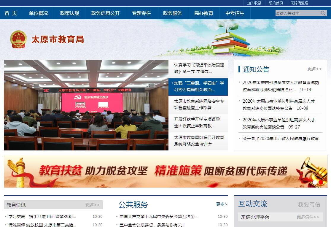 太原市教育局主要职责:1.贯彻落实党和国家有关教育工作的方针、政策、法律、法规,根据省、市工作部署,研究全市教育改革与发展战略,制定全市教育事业发展规划和年度计划,并做好组织协调实施工作;会同有关部门研究制定“科教兴市”的发展规划和年度计划;拟定太原市教育事业改革与发展的地方性法规、方针、政策和实施方案。2.会同有关部门做好全市各项教育经费、教育基建资金的筹措和使用工作。对市属教育事业单位的经费、国有资产和基本建设工作进行管理;参与制定多渠道筹措教育经费的政策及办法;参与对教育经费使用情况的监督,依法检查县(市、区)教育经费收支情况;参与全市各级各类学校的布局规划,审核、审批学校的新建、撤销、调整及土地、校舍、财产的转让或变更;理、指导全市校办产业工作。3.综合管理全市学前教育、九年义务教育、普通高中教育、中等职业教育、成人教育和“扫盲”作、市属高等教育和成人中专教育;直接管理市属学校、局属事业单位;指导协调市直各部门相关教育工作;按照权限管理全市社会力量办学工作;负责对各县(市、区)教育行政部门和学校工作进行导、检查、评估。4.指导、管理全市各级各类学校德育工作、体育卫生艺术教育工作、国防教育工作和学校安全保卫工作。5.主管全市教职工工作。负责学校教师和管理人员队伍的建设和管理工作;会同有关部门制定教育系统工资福利及人事管理工作的有关政策和规章制度;组织实施学校内部管理体制改革;统筹规划并组织、指导、检查、评估各级各类学校干部和教师培训工作;负责管理全市各级各类学校专业技术人员职务的评聘、考核;负责本地区幼儿园、中小学、中等专业学校、技工学校、职业学校教师资格认定和管理的组织、指导、监督和实施工作;负责教育系统外事及港、澳、台工作。6.统筹组织、管理全市大、中专学校招生、高等教育自学考试、成人教育招生考试、初、高中毕业考试工作;负责全市大中专毕业生就业分配制度改革,参与编制全市大中专毕业生就业计划,组织实施大中专学校毕业生就业指导工作。7.指导全市各级各类学校进行教育教学改革,组织各类学校开展教育科研、教学研究活动和教科研成果的推广工作。8.负责全市教育统计工作;负责全市教育信息的发布工作;指导教育学会、协会、研究会、基金会等教育社团组织的工作。9.负责贯彻落实国家语言文字工作的方针、政策;负责组织、协调和检查全市语言文字规范化建设工作;负责推广普通话和普通话测试工作。10.完成市政府交办的其他工作。