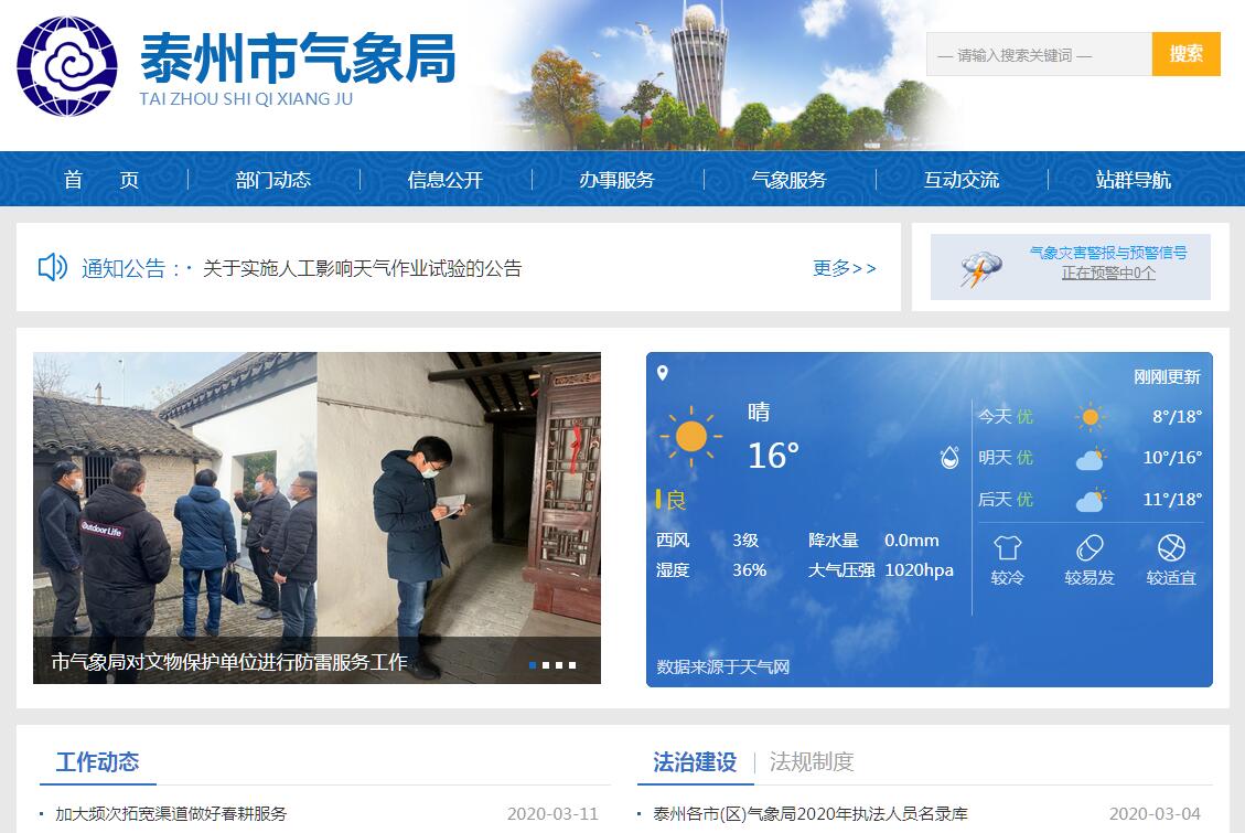 泰州市气象局于96年10月筹建,97年1月经中国气象局批准,在原县级泰州市气象局的基础上,升格组建地级气象局。现内设办公室、人事教育处、业务法规处等三个科级行政处室和气象台、专业气象台、防雷中心、财务核算中心等四个科级业务单位,辖靖江、泰兴、姜堰、兴化四个县级市气象局。全市气象部门现有在职职工81人(含内退4人)。其中35岁以下35人,占43%,本科以上学历33人,占41%,中级职称人员为41名,高级职称人员为5人,省局“1050”培养对象1人,省“333”第三层次学科带头人1人。市局在职职工32人(其中内退1人),35岁以下19人,本科以上学历20人,中级职称人员14人,高级职称人员3人。其主要职责:(一)制定地方气象事业发展规划、计划,并负责本行政区域内气象事业发展规划、计划及气象业务建设的组织实施;负责本行政区域内重要气象设施建设项目的审查;对本行政区域内的气象活动进行指导、监督和行业管理。(二)组织管理本行政区域内气象探测资料的汇总、分发;依法保护气象探测环境;管理本行政区域内涉外气象活动。(三)在本行政区域内组织对重大灾害性天气跨地区、跨部门的联合监测、预报工作,及时提出气象灾害防御措施,并对重大气象灾害作出评估,为本级人民政府组织防御气象灾害提供决策依据;管理本行政区域内公众气象预报、灾害性天气警报以及农业气象预报、城市环境气象预报、火险气象等级预报等专业气象预报的发布。(四)组织管理雷电灾害防御工作,会同有关部门指导对可能遭受袭击的建筑物、构筑物和其它设施安装的雷电灾害防护装置的检测工作。(五)制定人工影响天气作业方案,并在本级人民政府的领导和协调下,管理、指导和组织实施人工影响天气作业。(六)负责向本级人民政府和同级有关部门提出利用、保护气候资源和推广应用气候资源区划等成果的建议;组织对气候资源开发利用项目进行气候可行性论证。(七)组织开展气象法制宣传教育,负责监督有关气象法规的实施,对违反《中华人民共和国气象法》有关规定的行为依法进行处罚,承担有关行政复议和行政诉讼。(八)统一领导和管理本行政区域内气象部门的计划财务、机构编制、人事劳动、科研和培训及业务建设等工作;会同市人民政府对本市气象机构实施以部门为主的双重管理;协助地方党委和人民政府做好当地气象部门的精神文明建设和思想政治工作。(九)承担江苏省气象局和泰州市人民政府交办的其它事项。