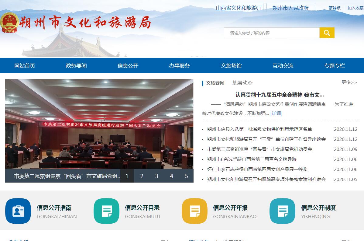 朔州市文化和旅游局主要职责:(一)贯彻落实党的文化工作方针政策,组织实施关于文化和旅游、广播电视、文物的法律法规,贯彻落实市委、市人民政府关于文化和旅游、广播电视、文物工作的决策部署,研究拟订文化和旅游、广播电视、文物政策措施,起草文化和旅游、广播电视、文物工作规范性文件草案。(二)统筹规划全市文化和文物及广播电视事业、文化产业和旅游业发展,制订发展规划和年度计划并组织实施。推进文化和旅游与相关领域的融合发展,推进文化和旅游、文物领域的体制机制改革。指导协调全市基层文化和旅游、广播电视,文物工作。(三)管理全市性重大文化和旅游、广播电视、文博交流活动。指导市级重点文化和旅游、广播电视、文物设施建设和基层文化和旅旅游设施建设。组织全市旅游整体形象推广,促进文化产业和旅游产业对外合作和市场推广。制订旅游市场开发规划并组织实施。提高旅游资源开发利用效能,指导、推进全域旅游,助推城镇化建设和新农村建设。(四)指导、管理全市文艺事业,指导协调艺术创作生产,扶持体现社会主义核心价值观、具有导向性代表性示范性的文艺作品,推动各门类艺术、各艺术品种发展。管理全市艺术教育,指导艺术教育体制改革。(五)负责公共文化和旅游事业发展,推进公共文化服务体系和旅游公共服务体系建设,深入实施文化与旅游惠民工程,统筹推进基本公共文化服务标准化、均等化。指导建立健全全市智慧旅游、旅游集散、旅游公共信息和咨询服务平台体系,推动旅游服务便利化。(六)组织实施文化旅游科技发展规划与广播电视传输网覆盖规划。指导、推进文化和旅游、广播电视、文物科技创新发展和科技研究成果的推广应用。推进文化和旅游、广播电视、文物行业信息化、标准化建设。组织实施文化与旅游、广播电视、文物领域的国家标准和行业标准。监管全市广播电视节目、网络视听节目内容和质量,指导、监管广播电视广告播放。负责监管全市广播电视节目传输、监测和安全播出。推进广播电视与新媒体新技术新业态融合发展,推进广电网与电信网、互联网三网融合。推进应急广播电视体系建设。(七)指导,管理全市文化遗产保护工作,拟订文物、博物馆事业规划和非物质文化遗产保护规划,协调和指导全市文物的保护、抢救、研究、宣传教育等工作,组织实施非物质文化遗产的保护、传承、普及、弘扬和振兴。(八)统筹规划文化产业和旅游产业,组织实施文化和旅游、文物资源的普查、挖掘、保护和利用工作,促进文化产业和旅游产业发展。指导重点旅游区域、旅游目的地和旅游线路的规划开发,引导休闲度假。负责假日旅游、特种旅游和红色旅游工作。按照省厅委托负责对旅游景区、景点质量等级评定。指导培育文化和旅游新产品、新业态,组织构建旅游产业体系。对工艺美术进行行业管理。(九)组织实施全市文化和旅游市场发展规划,指导文化和旅游、文物市场发展,依法对文化和旅游及文物市场、旅游服务质量进行综合监管,协调相关部门建立案件联合查办、投诉统一受理等综合监管机制,推进文化和旅游行业信用体系建设。监测旅游经济运行,发布旅游统计及行业信息。指导全市文化和旅游市场综合执法,督查督办大案要案,维护市场秩序。(十)负责文化和旅游、广播电视、文物等方面行政审批工作。负责对文化类旅游类社会组织进行登记前审查、核准和日常管理、监督。指导文化和旅游行业组织的业务工作。管理公民出国(境)旅游、边境旅游,负责出境组团社的审核。(十一)贯彻落实国家文化和旅游对外及对港澳台交流政策,指导、管理文化和旅游对外及对港澳台交流、合作和宣传、推广工作,组织实施重大文化和旅游对外及对港澳台交流活动,推动文化走出去。(十二)组织实施全市文化和旅游、广播电视、文物行业人才教育培训规划,组织实施从业人员职业资格制度和等级制度。(十三)综合协调、监督管理文化与旅游、广播电视、文物的安全工作,指导应急救援工作。(十四) 承担市委、市人民政府交办的其他任务。