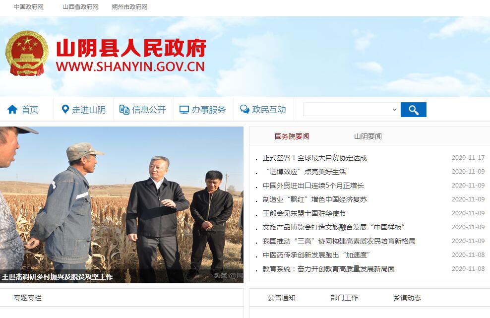 | 网站简介: 山阴县,历史文化名城,为山西省朔州市辖县,位于山西省北部,介于东经112°25′-113°04′,北纬39°11′-39°47′之间。东邻应县,南毗代县,西交朔城、平鲁二区,北与左云、右玉、怀仁接壤。全县辖4镇9乡,总面积1651平方千米,总人口24.1万人(2018年底年)。年均气温7℃左右。山阴县境内自然资源较为丰富,其中以煤炭为主,是产煤大县,有“煤乡”之称。2018年,全县地区生产总值完成179.69亿元,同比增长2.3 %;规模以上工业增加值同比下降5.4%;固定资产投资完成21.6亿元,同比增长22.1%;公共财政预算收入完成15.46亿元,同比增长35%;社会消费品零售总额完成43.36亿元,同比增长8.5%;城镇居民人均可支配收入预计达到34592元,同比增长6.5%;农村居民人均可支配收入预计达到16561元,同比增长8.4%。 |