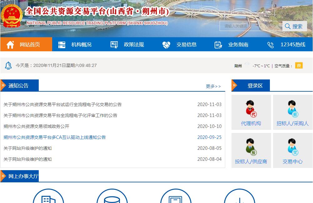 朔州市公共资源交易中心(朔州市政府采购中心)的主要职责是:(一)贯彻执行党中央、国务院、省委、省政府关于公共资源交易、政府集中采购的方针政策、法律法规和市委、市政府的决策部署。(二)负责组织推进市级公共资源交易平台深度整合。负责实施公共资源交易平台全流程电子化改革,推动实现与省平台互联互通,信息共享。落实市级政府采购制度改革要求,建立健全市级政府集中采购竞争机制。(三)组织开展市级公共资源交易工作,组织实施市级政府集中采购。制定市级公共资源交易和市级政府集中采购现场管理办法、工作流程和服务规范。(四)负责为各类市级公共资源交易提供场所、设施、信息等服务保障。(五)承担对进入市级公共资源交易平台的工程建设项目招标投标、土地使用和矿业权出让、国有产权交易、政府采购及药品、医疗设备采购、碳排放权、排污权、林权等其他公共资源交易活动的组织、协调、管理,见证、现场监督交易全过程。(六)负责建立市级公共资源交易主体场内信誉评价制度,协助建设公共资源交易信用评价体系。负责受理市级公共资源交易等事项的质疑投诉举报。协助配合有关部门查处现场交易、采购违法违规违纪行为。(七)负责市公共资源交易平台信息网络系统的建设维护管理。(八)承办市委、市人民政府及市行政审批服务管理局(市政务信息管理局)交办的其他任务。