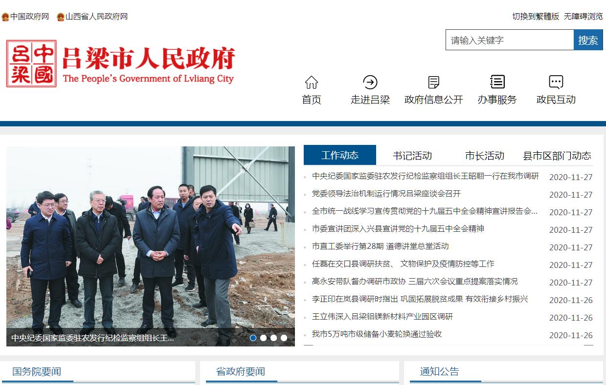 吕梁市介于北纬36°43'~ 38°43',东经110°22'~112°19',因吕梁山脉纵贯全境而得名,东西最大宽度140公里,南北最大距离220公里,周边界限总长954.3公里。吕梁位于山西省中部西侧,东部紧邻太原市、晋中市,西隔黄河与陕北相望,南部、北部分别与临汾市、忻州市接壤。面积2.1万平方公里,占全省面积的13.5%,耕地面积788万亩。1971年5月,组建吕梁地区,2004年7月,正式撤地设市。现辖1区(离石)2市(孝义、汾阳)10县(交城、文水、兴县、岚县、临县、方山、柳林、中阳、交口、石楼),161个乡镇、街道(81镇、67乡、13个街道),总人口389万。2019年全市实现地区生产总值1512.1亿元,其中第一产业增加值69.7亿元,同比增长1.9%,占地区生产总值的比重4.6%;第二产业增加值903.4亿元,同比增长5.5%,占地区生产总值的比重59.8%;第三产业增加值539亿元,同比增长6.5%,占地区生产总值的比重35.6%。人均地区生产总值38890元,按2019年平均汇率计算为5637美元。2020年10月20日,吕梁市入选全国双拥模范城(县)名单。