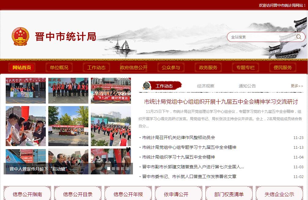 晋中市统计局主要职责:(一)组织领导和协调全市统计工作,确保统计数据真实、准确、及时。制定全市性的统计制度、统计标准和统计规划,指导全市统计工作;研究制定全市统计体制改革方案和实施方法,并组织贯彻实施;建立符合国家统计规则和省统计要求的现代统计调查体系,建立与国家治理体系和治理能力现代化要求相适应的统计管理体制机制。(二)建立健全全市国民经济核算体系,拟定并组织实施全市国民经济核算制度和全市投入产出调查方案,核算全市及各县(区、市)国内生产总值,汇编提供国民经济核算资料,监督管理各县(区、市)国民经济核算工作。(三)根据上级部门重大国情国力普查计划、方案,组织实施全市人口、经济、农业等重大国情国力普查,汇总、整理和提供有关全市国情国力方面的统计数据。(四)组织实施全市农林牧渔业、工业、建筑业、批发和零售业、住宿和餐饮业、房地产业、租赁和商务服务业、居民服务和其他服务业、文化体育和娱乐业以及装卸搬运和其他运输服务业、仓储业、计算机服务业、软件业、科技交流和推广服务业、社会福利业等统计调查,收集、汇总、整理和提供有关调查的统计数据;综合整理地质勘查、旅游、交通运输、金融、保险、邮政、电信、教育、卫生、社会保障、公用事业等全市性基本统计数据。(五)组织实施管理全市能源、投资、消费、科技、人口、社会发展基本情况、环境基本状况等统计调查,收集、汇总、整理和提供有关调查的统计数据,综合整理资源、对外贸易、对外经济等全市性基本统计数据。(六)组织全市各县(区、市)、各部门的经济、社会、科技和资源环境统计调查,统一核定、管理、公布全市性基本统计资料,定期发布全市国民经济和社会发展情况的统计信息,组织建立部门间统计信息共享制度和发布制度。(七)对国民经济、社会发展、科技进步和资源环境等情况进行统计监测、统计分析和统计监督,向市委、市政府及有关部门提供统计信息和咨询建议。(八)依法审批或者备案各部门统计调查项目、地方统计调查项目;指导专业统计基础工作、统计基层业务基础建设;组织建立服务业统计信息管理制度;建立健全统计执法检查制度和统计数据质量责任制,开展对重要统计数据的审核、监控和评估。(九)协助管理各县(区、市)统计局局长、副局长;协助管理省统计局设在晋中的调查监测中心;指导全市统计专业技术队伍建设,会同有关部门组织全市统计专业资格考试及职称评聘;监督管理中央及省、市财政提供给县(区、市)的统计经费;加强对全市统计专业队伍建设和管理,通过培训教育,提高全市统计人员的素质。(十)建立并管理全市统计信息自动化系统和统计数据库系统,组织制定各县(区、市)、各部门统计数据库和网络的基本标准和运行规则,指导全市统计信息化建设。(十一)参与全市性综合类考核相关工作。(十二)开展统计工作和统计科学的交流与合作。(十三)完成市委、市人民政府交办的其他任务。
