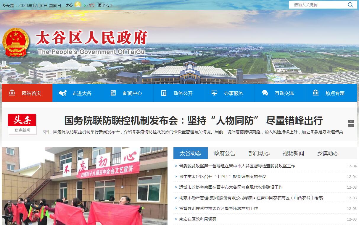 | 网站简介: 太谷区,隶属于山西省晋中市,位于晋中盆地东北部,地理座标介于东经112°28'~ 113°01′,北纬37°12′~37°3′2之间,东西50公里,南北39公里,总面积1050平方公里,全区常住人口为313303人。截至2019年,太谷区辖3个镇,6个乡和3个社区。2018年,太谷县生产总值96.6亿元,同比增长5.1%。其中,第一产业完成21.3亿元,同比增长0.9%;第二产业完成24.4亿元,同比增长5.6%;第三产业完成50.9亿元,同比增长6.5%;三次产业构成为22:25.3:52.7。与上年相比,第一产业提高0.7个百分点,第二产业下降2.2个百分点,第三产业提高1.6个百分点。 |