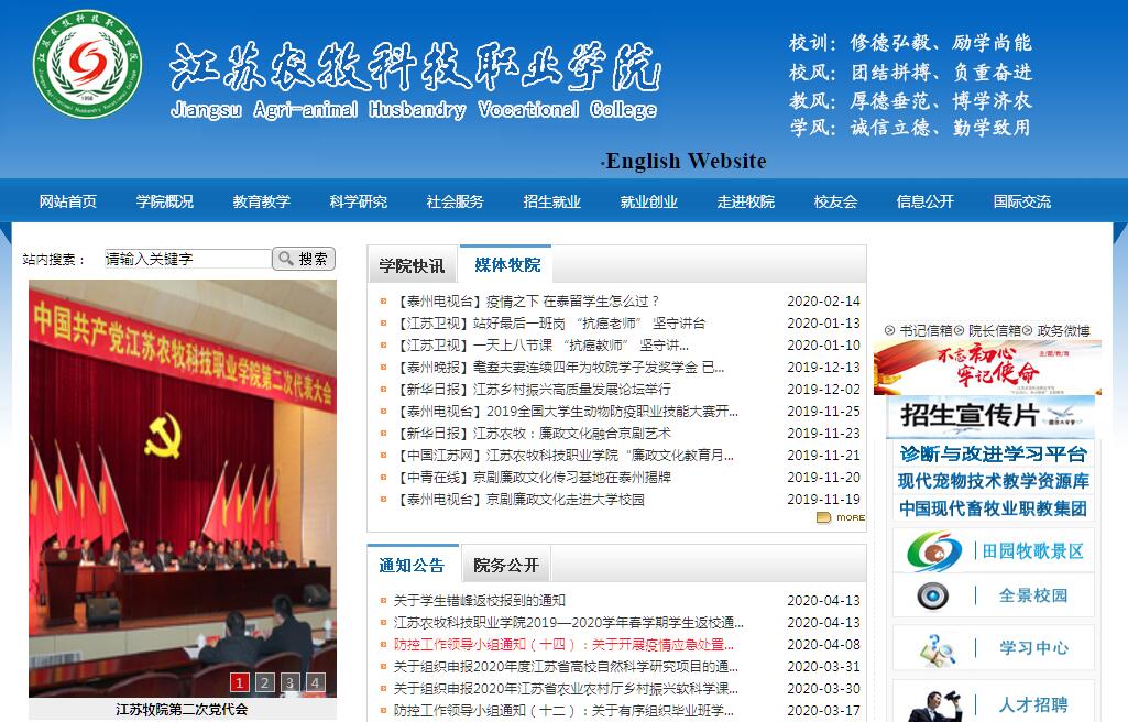 江苏农牧科技职业学院始建于1958年9月,校名为“泰县农业中等技术学校”。1959年1月更名为“泰州市农业专科学校”;1961年9月更名为“江苏省泰州畜牧兽医学校”;1995年4月更名为“江苏省畜牧兽医学校”;2001年6月独立升格为“江苏畜牧兽医职业技术学院”;2013年3月更名为“江苏农牧科技职业学院”。学校是我国东南沿海地区乃至我国南方14个省(市、自治区)唯一以培养农牧科技类技术技能型人才为主的高等院校,座落在中共中央前总书记、原国家主席胡锦涛的出生地——江苏省泰州市,也是世界知名艺术大师梅兰芳先生的故乡。2005年,学校以“优秀”等级在全省率先通过教育部高职高专人才培养水平首轮评估;2008年,被确定为“江苏省示范性高等职业院校”;2010年,被教育部、财政部确定为“国家示范性高等职业院校建设计划”首批“国家骨干高职院建设单位”,2013年,以“优秀”等级通过建设项目验收。从此,学校进入全国高职院校第一方阵,成为全国农业高职院校的排头兵。2016年3月20日,时任中共中央政治局委员、国务院副总理汪洋来校视察,对我校服务“三农”的办学成效给予了充分肯定。学校占地面积4600亩,校舍建筑面积58万平方米,形成了以凤凰路校区为主体、以畜牧科技园和中药科技园为两翼的“一主两翼”办学格局。学校拥有各类实验室、实训室200多个,建有江苏现代畜牧科技园、江苏中药科技园、江苏姜曲海猪种猪场、江苏苏姜种猪核心种猪场、中牧倍康药业、教学动物医院、教学宠物医院、田园牧歌景区、本草养生景区等36个院内实训基地,校外实训实习基地700多个,图书馆藏书109.24万册,教学科研仪器设备总值2.5亿元。学校面向全国25个省(市、自治区)招生,现有在校生14800多人。中国科学院院士、南开大学原校长饶子和担任学院名誉院长,国内外20多位知名教授包括6位两院院士担任学校兼职教授。学校现有专任教师648人,其中,副高以上职称教师232人,正教授58人(二级教授4人、三级教授9人),具有博士、硕士学位教师490人。专业课教师中,“双师型”教师占91%。享受国务院特殊津贴1人、新中国60年畜牧兽医科技杰出贡献人物1人、江苏省有突出贡献的中青年专家3人、全国农业职教名师7人,江苏省科技创新团队2个。学校秉承“紧扣农牧产业链办学,紧密结合产学研育人,紧跟区域增长极发展”的办学理念,设有动物科技学院、动物医学院、动物药学院、食品科技学院、宠物科技学院、园林园艺学院、水产科技学院、农商管理学院、农业信息学院、农业工程学院、国际教育学院、继续教育学院和基础部、思政部、体育部等12个二级学院和3个部。围绕农牧产业链设置40个专业,其中,国家级重点专业6个、省级品牌(骨干)特色专业11个、省重点专业群建设点4个。学校先后获省部级以上教育教学成果60多项,其中,国家级教学成果一等奖1项、二等奖4项,省级教学成果特等奖2项、一等奖4项、二等奖7项,国家级职业教育现代宠物技术教学资源库1个、国家级职业教育动物药学专业备选教学资源库1个,国家现代学徒制试点单位1个,国家级精品课程2门、国家级精品共享课程2门,省级精品课程7门,省级在线开放课程5门。学校建有国家水禽基因库和姜曲海猪保种场2个国家级保种与研发机构,建有江苏省兽用生物制药高技术研究重点实验室、省动物医药创制中心、省现代畜牧与新兽药工程技术中心、省畜产品深加工工程技术研究开发中心、省种猪生产性能测定中心、省水禽生产性能测定中心、省动物药品工程研究开发中心等15个省级研发中心、17个市级研发平台和8个校级研究所。2007年以来,学校先后承担部、省、市级项目共1000多项,其中,国家发改委重大项目2项、农业部项目32项、科技部项目5项、教育部项目9项、国家自然科学基金5项。培育出了具有自主知识产权的苏姜猪新品种,开发国家级二类新兽药2个。先后获全国农牧渔业丰收奖一等奖1项,农业部中华农业科技奖二等奖1项、三等奖1项,江苏省科技进步二等奖3项、三等奖4项,江苏省农业技术推广奖一等奖1项、二等奖2项。学校组建了科技服务团队,强力推进强农富民“五项工程”,实施“品种+技术+基地”服务模式,推广新品种、新技术、新成果,科技服务“三农”,有力地推动了农村发展、农业增收、农民致富。学校与美国、英国、澳大利亚、加拿大、德国、荷兰、新加坡、台湾以及非洲、东南亚等国家和地区的70余所高等院校或教育培训机构建立了友好合作关系。多次举办非洲及东南亚籍动物科学技术专业留学生培训班,现有非洲、东南亚、中亚、欧洲23个国家的学籍留学生近300人,语言生及短期培训生100多人。2007年以来,学校获得了“全国职教先进单位”、“全国绿化模范单位”、“全国毕业生就业典型经验高校50强”、“全国创新创业典型经验高校50强”、“全国高职院校服务贡献”50强之首、“全国高职院校国际影响力50强”、“全国高职院校教学资源50强”;“江苏省文明单位标兵”、“江苏省文明校园”、“江苏省高校毕业生就业先进单位”、“江苏省职业技能大赛先进高校”、“江苏省科技工作先进高校”、“江苏省师资队伍建设先进高校”、“江苏省大学生思想政治工作先进单位”、“江苏省大学生创业教育示范校”、“江苏省和谐校园”、 “江苏省挂县强