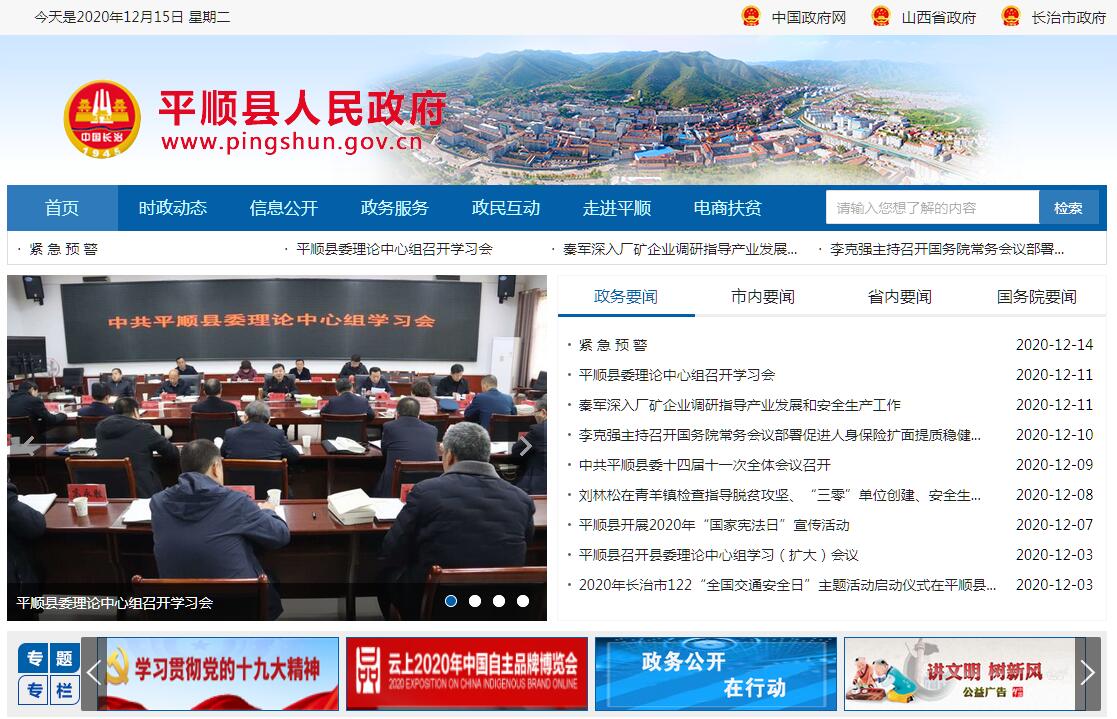 | 网站简介: 平顺县隶属山西省长治市,位于山西省东南部,长治市东部,县域面积1550平方公里,辖5个镇、7个乡,户籍人口15.25万人(2018年)。境内主要种植玉米、谷子、小麦、马铃薯等作物,盛产花椒、党参、连翘。工业门类有采矿、冶金、建材、水电、风电、机械、农副产品加工等。旅游景区主要有太行水乡、通天峡、天脊山、神龙湾、西沟村等。瓦日铁路、长平高速公路横贯全境。2018年9月25日,获得商务部“2018年电子商务进农村综合示范县”荣誉称号。平顺县城获评2018年重新确认国家卫生县城(乡镇)。2018年,平顺县全县地区生产总值21.61亿元,比上年增长7.2%。其中,第一产业增加值2.72亿元,增长2.9%,占生产总值的比重12.6%;第二产业增加值5.91亿元,增长8.5%,占生产总值的比重27.3%;第三产业增加值12.98亿元,增长7.2%,占生产总值的比重60.1%。2020中国夏季休闲百佳县市。 |