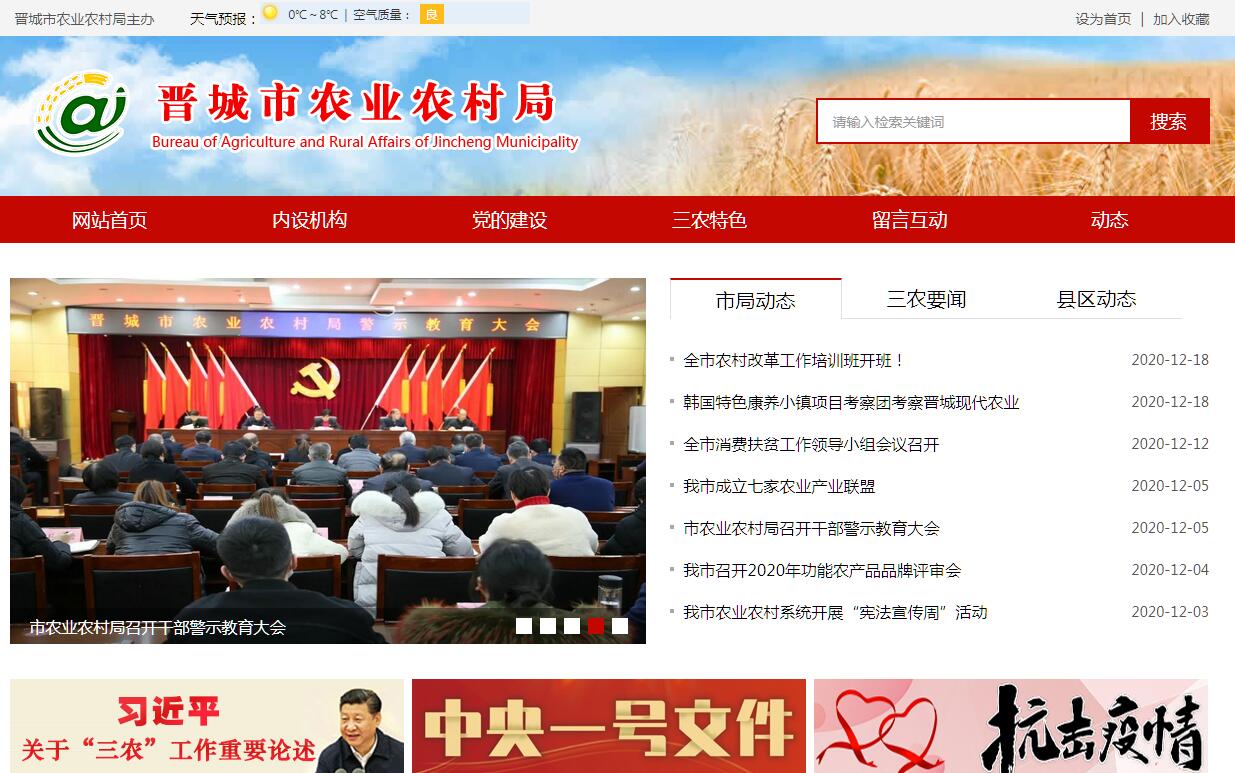 晋城市农业农村局主要职责:(一)贯彻落实国家和省委、省政府有关农业、农村的政策措施,统筹研究和组织实施全市“三农”工作的发展战略、中长期规划、重大政策。根据市委、市政府决策部署,组织、指导、统筹、协调各涉农单位,加大统筹农村经济社会发展力度,夯实农业农村发展基础,推进农村改革发展,推动全市农业和农村平稳快速发展。(二)贯彻执行有关农业和农村工作的法律、法规、规章。制定规范文件,指导农业综合执法。负责农业行政审批制度改革工作。承担全市农业农村工作重大决策的前期调研、政策拟定、统筹协调、目标制定、考核评价等工作。参与落实涉农财税、价格、收储、金融、保险、进出口等政策措施。总揽全市农业农村工作全局,统筹协调涉农政策、项目、资金等,促进各项工作协调推进。(三)组织协调推进全市乡村振兴战略实施,统筹推动发展农村社会事业、农村公共服务、农村文化、农村基础设施和乡村治理。牵头组织农村人居环境。协调推进农村精神文明和优秀农耕文化建设。(四)组织实施深化全市农村经济体制改革和巩固完善农村基本经营制度的政策落实。负责农民承包地、农村宅基地改革和管理有关工作。负责农村集体产权制度改革,指导农村集体经济组织发展和集体资产管理工作。指导监督减轻农民负担和村民“一事一议”筹资筹劳管理。指导农民合作经济组织、农业社会化服务体系、新型农业经营主体建设与发展。(五)指导乡村特色产业、农产品加工业、休闲农业、城郊农业以及新产业新业态发展工作。制定全市中药材产业规划,负责全市中药材生产、管理。提出促进大宗农产品流通的建议,培育、保护地方农业品牌。发布农业农村经济信息,监测分析农业农村经济运行。承担农业统计和农业农村信息化有关工作。(六)负责全市种植业、畜牧业、渔业、农垦、农业机械化等农业各产业的监督管理。组织落实粮食等农产品生产政策措施。指导农业供给侧结构调整,组织构建现代农业产业体系、生产体系、经营体系。指导农业标准化生产。(七)负责全市渔业、渔政工作,指导全市渔业生产结构和布局调整。指导全市渔业资源、渔业水域生态环境的保护和管理,并负责水生野生动植物管理。拟定全市渔业发展规划、技术进步措施。行使渔政监督管理权。组织协调渔业生产、科研、技术推广、水产品质量安全监测工作。组织、指导水生生物病害防控工作。(八)负责农产品质量安全监督管理。组织开展全市农产品质量安全监测、追溯、风险评估。按照职责权限发布有关农产品质量安全状况信息。提出区域技术贸易措施的建议。参与制定农产品质量安全标准并会同有关部门组织实施。指导农产品质量安全监管体系、农业检验检测体系、信用体系建设。依法实施符合安全标准的农产品认证和监督管理有关工作。(九)组织农业资源区划工作。指导全市农用地、渔业水域以及农业生物物种资源的保护与管理。负责耕地及永久基本农田质量保护、水生野生动植物保护管理工作。组织负责全市农田水利基本建设、农田整治、高标准农田建设工作。指导农产品产地环境管理和农业清洁生产。运用农艺、农机、生物等工程措施发展有机旱作农业。指导设施农业、生态循环农业、节水农业发展以及农村可再生能源综合开发利用、农业生物质产业发展。牵头管理外来物种。(十)负责有关农业生产资料和农业投入品的监督管理。组织农业生产资料市场体系建设,拟订有关农业生产资料地方标准并监督实施。负责农作物种子(种苗)、种畜禽、农药、肥料、兽药、兽医医疗器械、饲料及饲料添加剂等监督管理。组织兽医医政、兽药药政药检工作,负责执业兽医和畜禽屠宰行业管理。(十一)负责农业防灾减灾、农作物重大病虫害防治工作。指导动植物防疫检疫体系建设。承担植物保护工作。组织、监督全市动植物防疫检疫工作,发布疫情并组织扑灭。(十二)负责农业投资管理。提出全市农业投融资体制机制改革政策建议。编制农业投资项目建设规划,提出农业投资规模和方向、扶持农业农村发展财政项目的建议。按市人民政府规定权限审批农业投资项目,负责农业投资项目资金安排和监督管理。统筹农业综合开发项目。(十三)推动农业科技体制改革和农业科技创新体系建设。拟订全市农业科研、农技推广规划、计划和有关政策。指导农技推广体系和农业产业技术体系建设,组织开展全市农业领域的高新技术和应用技术研究、科技成果转化和技术推广。负责农业科技成果管理。负责农业转基因生物安全监督管理和农业植物新品种保护。(十四)指导农业农村人才工作。拟订全市农业农村人才队伍建设规划并组织实施,指导农业教育和农业职业技能开发,指导新型职业农民培育、农业科技人才培养和农村实用人才培训工作。承担农村劳动力转移就业培训工作,依法实施农业农村人才专业技术资格和从业资格培训。(十五)牵头开展全市农业对外合作工作。承办农业涉外事务,组织开展农业贸易促进和有关国际国内经济、技术交流和合作。具体执行有关农业援外项目。(十六)承担市脱贫攻坚领导小组日常工作。负责全市扶贫开发工作。研究拟定全市扶贫开发工作的政策、规划并组织实施。协调全市行业扶