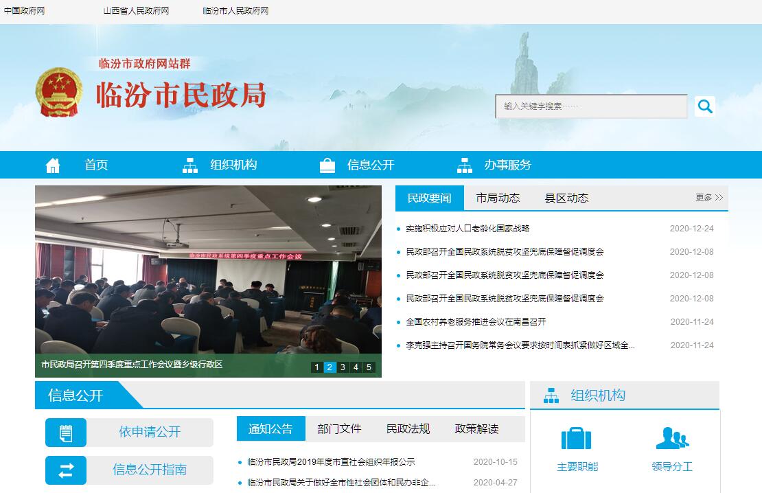 临汾市民政局主要职责:(一)组织实施民政事业的法律、法规和方针、政策。起草民政事业规章草案和规范文件并监督实施。拟定民政事业发展规划、年度计划、相关措施并组织实施。(二)组织实施全市社会组织登记和监督管理办法,依法对社会组织进行登记管理和执法监督。负责社会组织党建工作。(三)牵头拟订全市社会救助规划、政策和标准,健全城乡社会救助体系,指导建立、健全和实施全市城乡居民最低生活保障、特困人员救助供养、临时救助、生活无着流浪乞讨人员救助工作。(四)拟定城乡基层群众自治建设和社区治理政策,指导城乡社区治理体系和治理能力建设,提出加强和改进城乡基层政权建设的建议,推动基层民主建设。(五)指导监督和协调本市地名管理工作,制定本市地名工作规划。审核、承办本辖区地名的命名、更名。推行地名的标准化、规范化,查处违法违章使用地名行为。指导、设置地名标志,检查、监督、管理地名标志的使用。负责审核、编纂本市的地名工具图书。负责全市的行政区域界线勘定和管理,负责全市行政区域内边界争议的调整和争议调处。(六)拟定婚姻管理政策,推进婚俗改革。(七)拟定殡葬管理政策、服务规范,推进殡葬改革。(八)统筹推进、督促指导、监督管理养老服务工作,拟定并组织实施养老服务体系建设规划、政策和相关标准。(九)拟定残疾人权益保护政策,统筹推进残疾人福利制度建设。(十)拟定并组织实施儿童福利、孤弃儿童保障、儿童收养、儿童救助保护政策和相关标准,健全农村留守儿童关爱服务体系和困境儿童保障制度。(十一)拟定并组织实施促进慈善事业发展政策,指导社会捐助工作,负责福利管理工作。(十二)拟定并组织实施社会工作、志愿服务政策和相关标准,会同有关部门推进社会工作人才队伍建设和志愿者队伍建设。(十三)完成市委、市人民政府交办的其他任务。