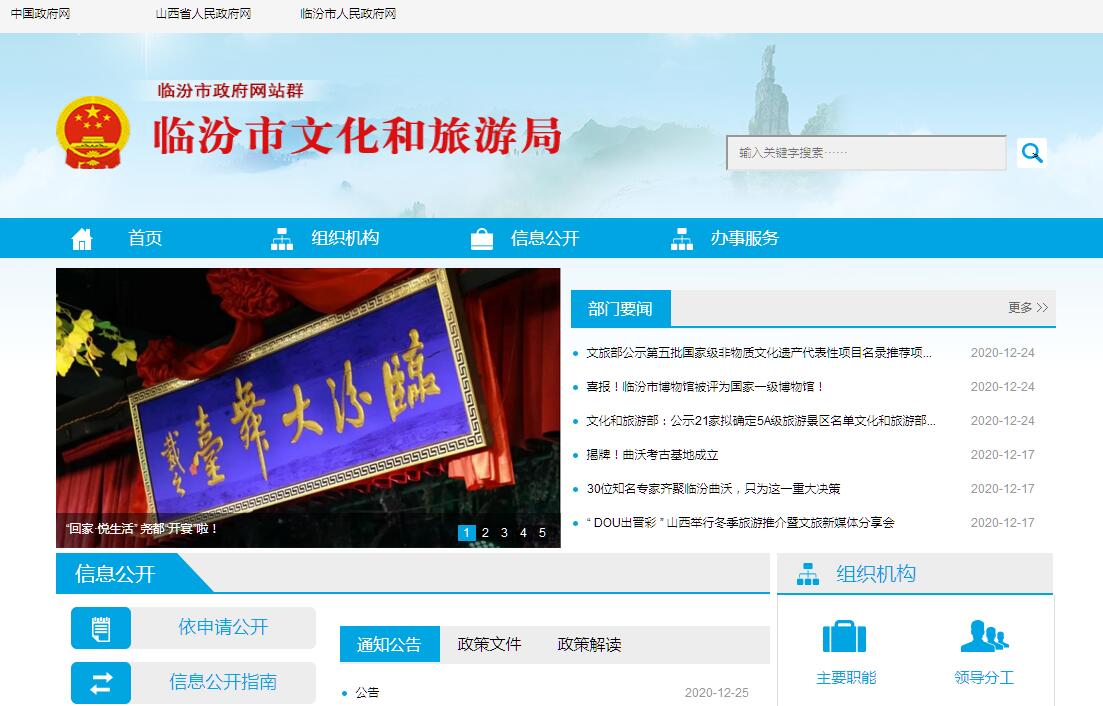 临汾市文化和旅游局主要职责:1、贯彻落实市委、市人民政府关于文化、旅游、文物、广电工作的决策部署,研究拟订文化、旅游、文物、广电政策措施,起草文化、旅游、文物、广电地方法规草案及规范文件并监督实施。2、统筹规划全市文化事业、文化产业、旅游业、文博事业、广电事业发展,制定发展规划和年度计划并组织实施。推进文化旅游业与相关领域的融合发展,推进文化、旅游、文物、广电领域等体制机制改革。指导协调全市基层文化、旅游、文物、广电工作。3、指导全市重大文化和旅游活动。指导市级重点文化设施建设和基层文化设施建设。组织全市旅游整体形象推广,促进文化产业、旅游产业、文博事业对外合作和国际、国内市场推广。制定旅游市场开发战略并组织实施。提高旅游资源开发利用效能,指导、推进全域旅游,助推城镇化建设和新农村建设。4、指导、管理全市文艺事业,指导协调艺术创作生产,扶持体现社会主义核心价值观、具有导向代表示范的文艺作品,推动各门类艺术、各艺术品种发展。5、负责公共文化事业发展,推进公共文化服务体系和旅游公共服务体系建设,深入实施文化惠民工程,统筹推进基本公共文化服务标准化、均等化。指导建立健全全市智慧旅游、旅游集散、旅游公共信息和咨询服务平台体系,推动旅游服务便利化。6、拟订全市艺术教育、文化、文物、广电科技发展规划并组织实施。指导、推进文化、旅游、广电科技创新和文物保护科技发展,推动文化、旅游、文物、广电科技研究成果的推广应用。推进文化和旅游行业信息化、标准化建设。管理全市艺术教育、文化科技研究工作,指导艺术教育体制改革。组织实施旅游区、旅游设施、旅游服务、旅游产品等方面的国家标准和行业标准,会同有关部门拟订全市旅游业的地方标准并组织实施。7、贯彻落实国家有关非物质文化遗产保护政策,负责全市非物质文化遗产保护,拟订非物质文化遗产保护规划,组织实施非物质文化遗产的保护、传承、普及、弘扬和振兴。8、统筹规划文化产业、旅游产业和文博事业,组织实施文化和文物旅游资源普查、挖掘、保护和利用工作,促进文化产业、旅游产业和文博事业发展。指导重点旅游区域、旅游目的地和旅游线路的规划开发,引导休闲度假。负责对旅游景区、景点质量等级评定和公告。负责假日旅游、特种旅游和红色旅游工作。指导培育文化和旅游新产品、新业态,组织构建旅游产业体系。对工艺美术进行行业管理。9、拟订全市文化、旅游和文物市场发展规划,指导文化、旅游和文物市场发展,对文化、旅游、文物市场经营进行行业监管,推进文化和旅游行业信用体系建设,依法规范文化、旅游、文物市场,依法管理文物流通。强化对全市文化、旅游、文物市场秩序和服务质量的综合监管,建立健全旅游综合协调、旅游案件联合查办、旅游投诉统一受理等综合监管机制,引导全社会文明旅游。监测旅游经济运行,负责文化、旅游、文物、广电统计及行业信息发布。综合协调、监督管理文化、旅游、文物、广电行业安全,指导应急救援工作。管理公民出国(境)旅游、边境旅游。10、负责文化、旅游、文物和广电领域的行政审批及改革相关工作。负责文物进出境有关许可工作。负责对文化类、旅游类、文物类、广电类社团组织进行登记前审查、核准和日常管理、监督。指导文化、旅游、文物、广电行业组织的业务工作。11、指导全市文化、旅游、文物、广电市场综合执法,组织查处全市、跨区域文化、旅游、文物及广电等市场的违法行为,协调配合督查督办大案要案,维护市场秩序。12、贯彻落实国家文化、旅游、文物、广电对外及对港澳台交流政策,指导、管理文化、旅游、文物、广电对外及对港澳台交流、合作和宣传、推广工作,组织实施重大文化、旅游、文物对外及对港澳台交流活动,推动临汾文化走出去。13、制定并组织实施全市文化、旅游、文物、广电行业人才教育培训规划,组织实施从业人员职业资格制度、等级制度及专业技术人员资格评审。14、负责世界文化遗产的推荐申报、保护和管理的监督工作。协同有关部门承担世界文化与自然双重遗产和国家及省历史文化名城(镇、村)的推荐申报和相关保护管理的监督工作。推荐、申报全国重点文物保护单位、省级文物保护单位。承担市级文物保护单位的审核认定工作。15、管理指导全市文物保护和考古工作,组织协调重大文物保护和考古项目的实施。负责全市文物保护和考古有关项目的审核、申报、审批和相关资质、资格的审核、申报工作。16、指导全市博物馆业务工作,负责全市各类博物馆有关审核、申报、审批工作和相关资质、资格的审核、申报工作。协调博物馆间的交流与协作。17、承担市委、市人民政府交办的其他任务。